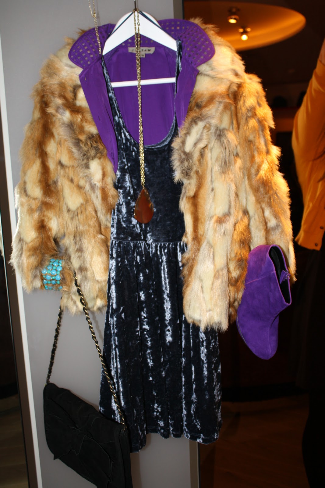 As I love a lot of colour, my outfit was a party look that could easily be worn during the day as a head turner. With a faux fur coat, velvet dress and blouse to mix up the textures, I finished off the look with some gorgeous purple boots and grey bow front bag.