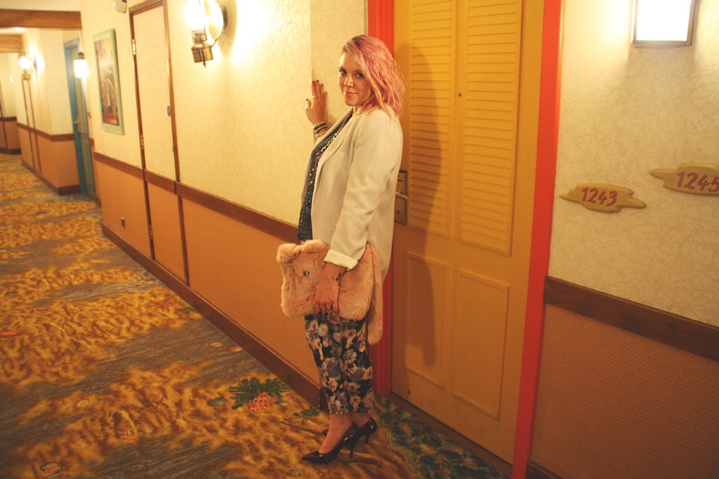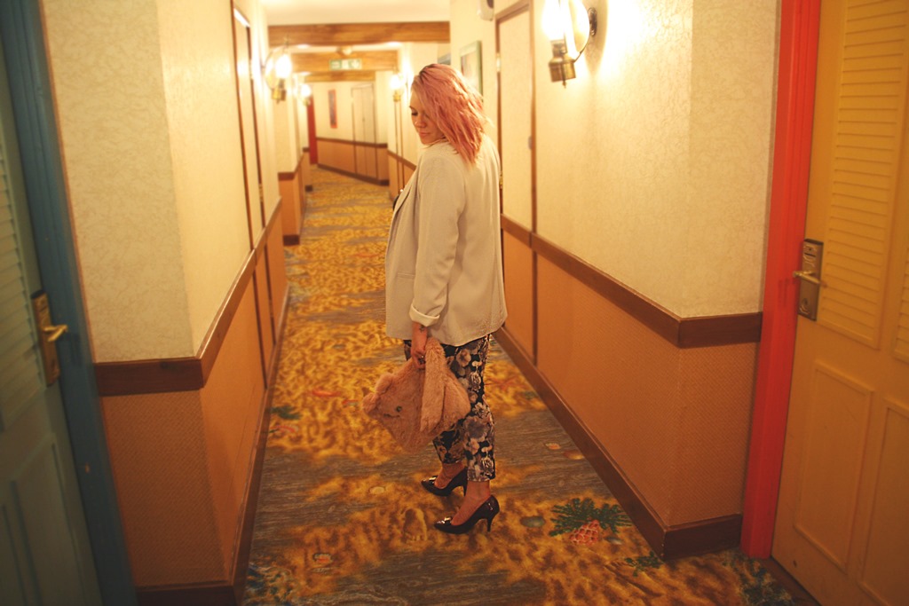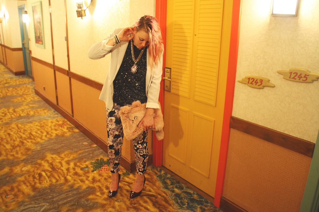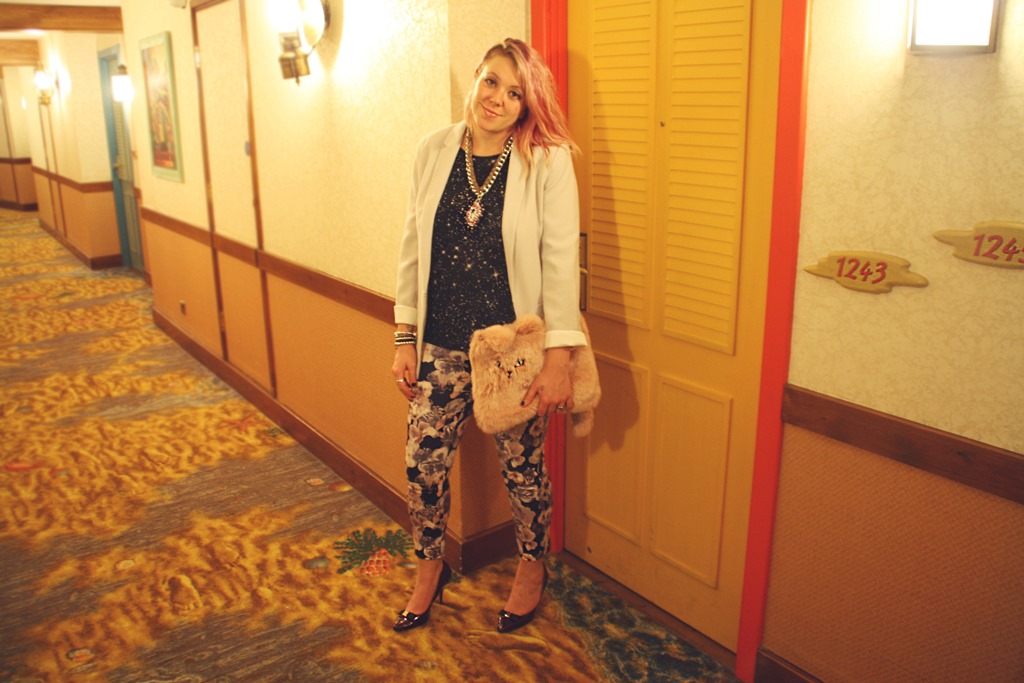 I’m not really one for Trousers as I don’t think they suit my shape but I love these Scuba floral print ones from New Look. They are highwaisted so are easy to mix with different layers and levels and they are really slimming too. With a hint of pink among black and greys. these trousers looked ace with this look and matched my clutch perfectly!