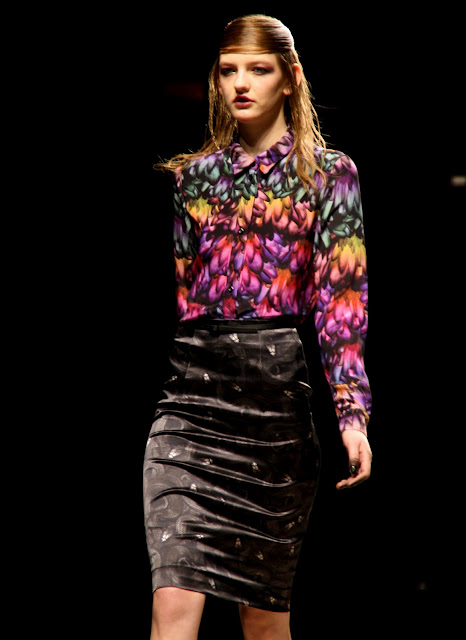 Dark Angels of the night graced the catwalk for Aminaka Wilmont’s latest London Fashion Week show. With the label’s new signature print draped over the models as dresses, silk trousers and skirts, an appearance of colourful feathers really blighted up a very ladylike yet gothic look. As well as blackened finger tips and swept hair, fur inserts and leather toughened up the evening wear and gave the collection a more harder edge for A/W 2012.