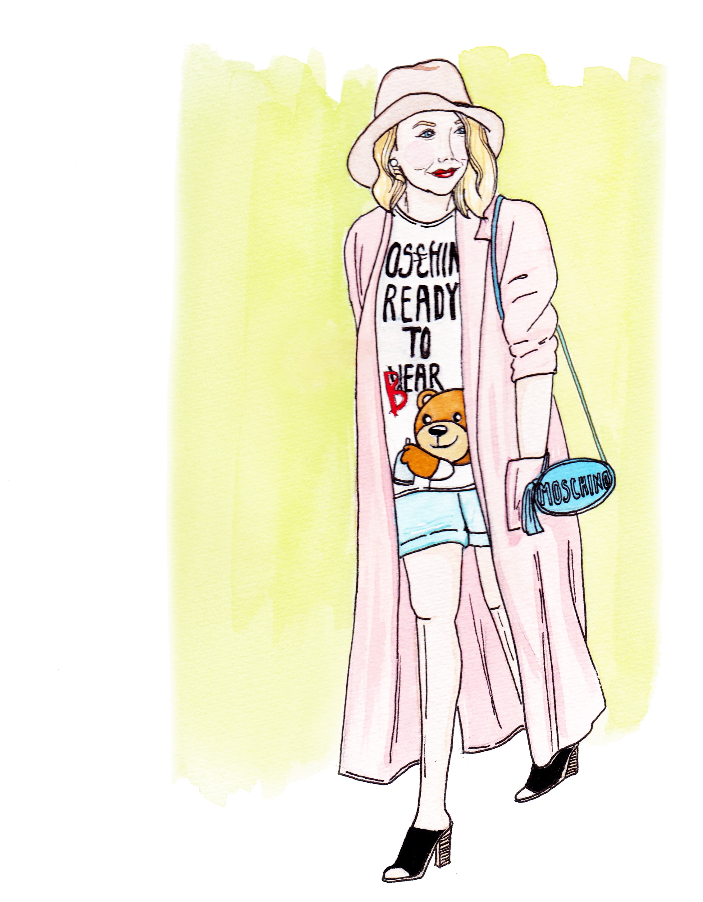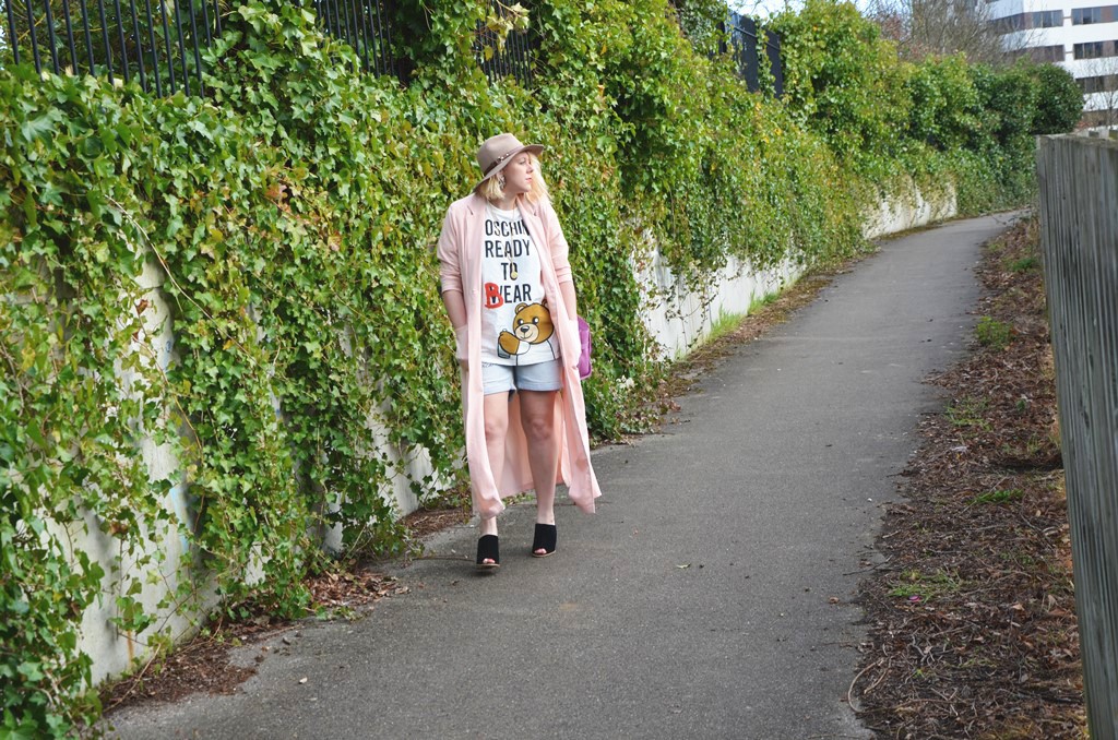 This is too cute! I love how you styled this Moschino print. The duster coat really finishes the look off 🙂