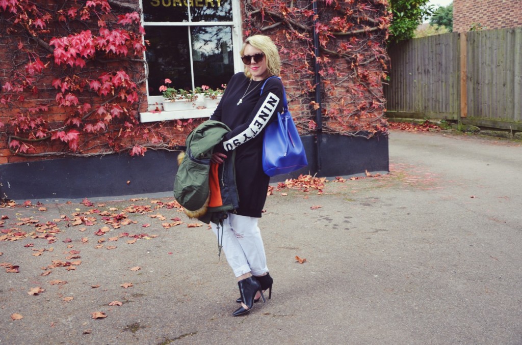 Me and jumpers have a funny relationship. Most of the time I find them lumpy, bumpy and not friendly to girls with big bangers but this jumper dress from ASOS works pretty well for my shape. It works great with my retro style here and with ‘1990’ plastered on my back, this outfit is a big nod to my childhood and more carefree times.
