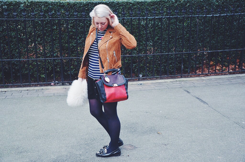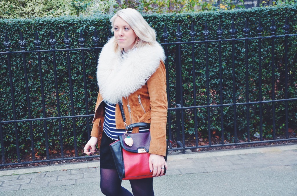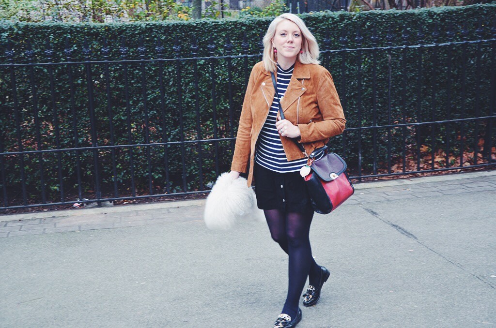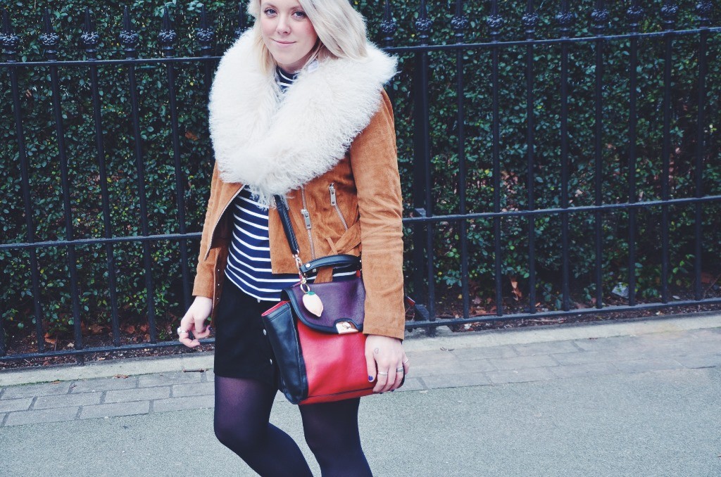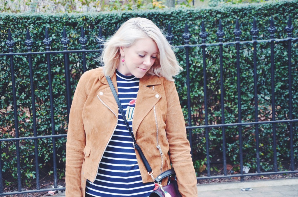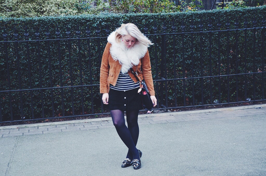 As suede was a material worn massively during the hippy period, I wanted to try wearing this cool fabric and I have to say, I am pretty pleased with how this look turned out. New Look have some great pieces you can still get hold of including this cute popper button skirt and cool tan suede biker jacket. I loved wearing these clash of suedes and with a cute stripe top and some sensible brogues, this is a girlie look that I loved to wear on my birthday and it was uber comfortable too.