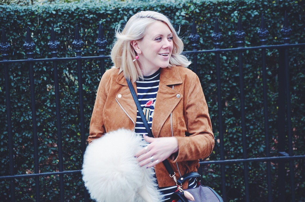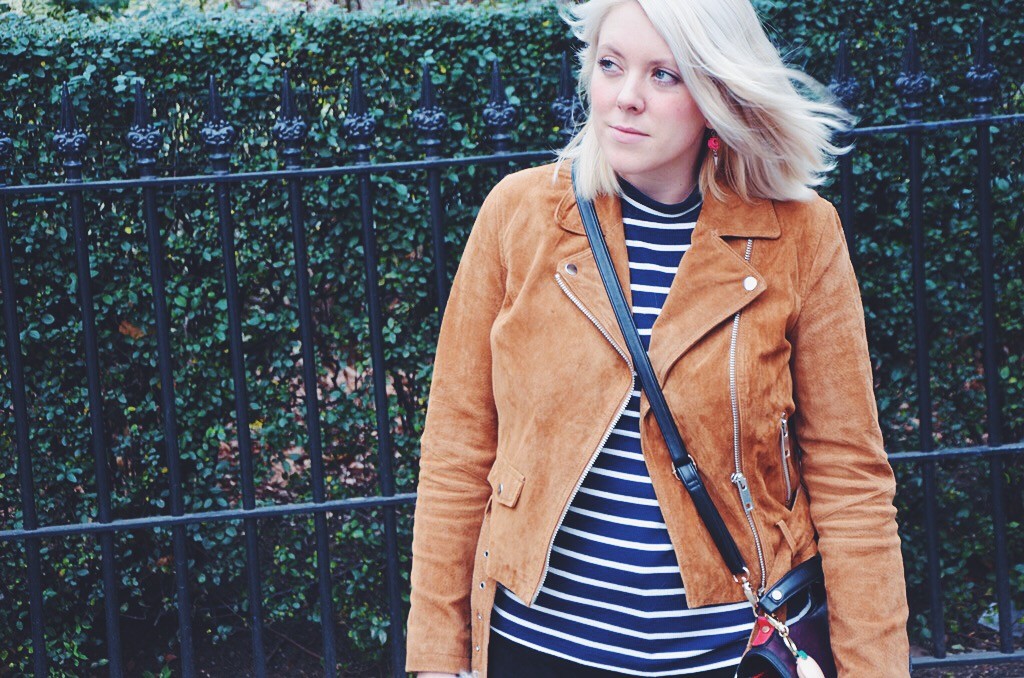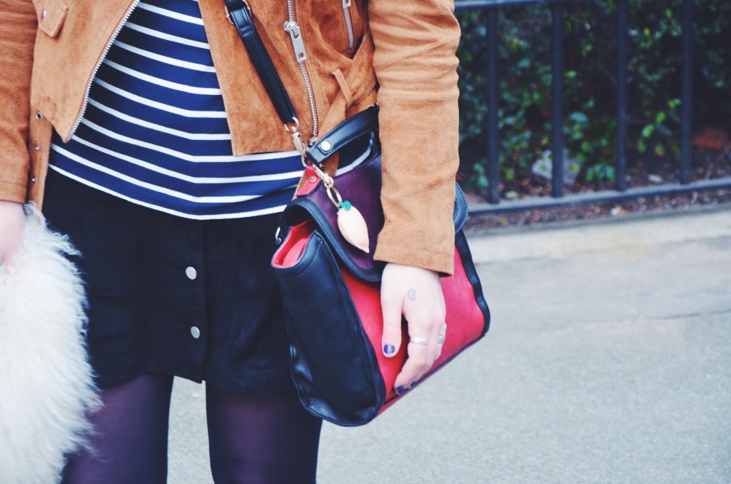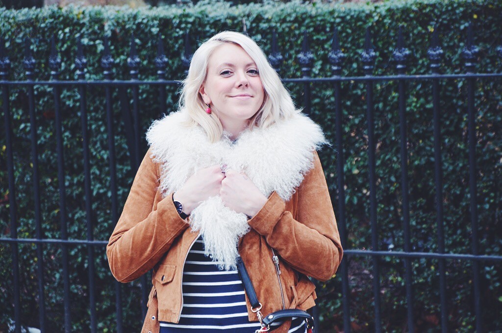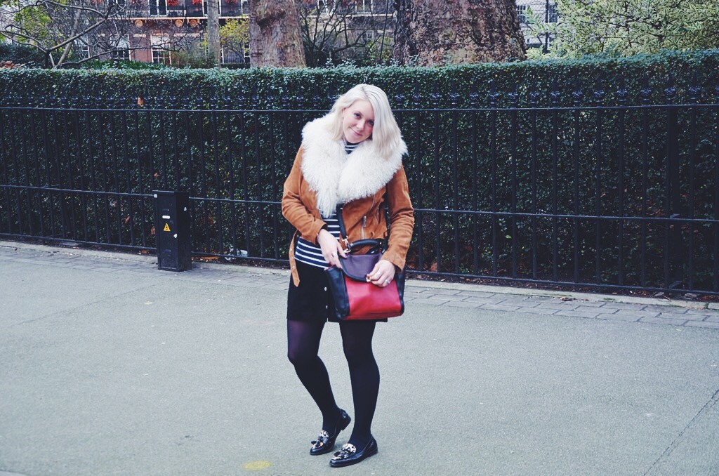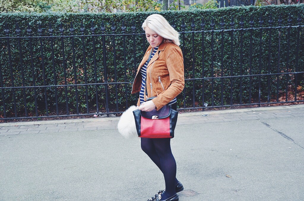 As suede was a material worn massively during the hippy period, I wanted to try wearing this cool fabric and I have to say, I am pretty pleased with how this look turned out. New Look have some great pieces you can still get hold of including this cute popper button skirt and cool tan suede biker jacket. I loved wearing these clash of suedes and with a cute stripe top and some sensible brogues, this is a girlie look that I loved to wear on my birthday and it was uber comfortable too.