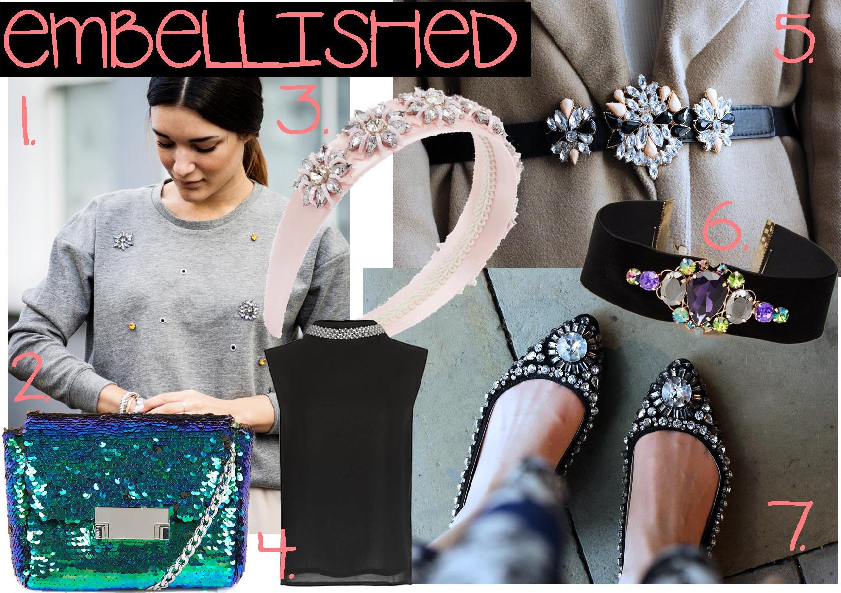 Embellishment is great for Christmas time and it is ideal for making a plain jumper or dress look extra special and unique. Ladies can have embellishment on anything now, from chokers to belts, heels to sunnies and they add that certain gorgeous and chic twist to a simply and sometimes essential item.