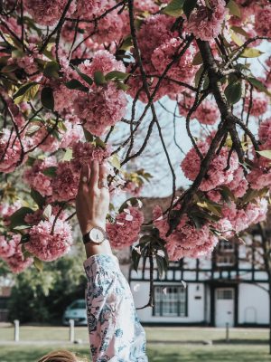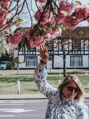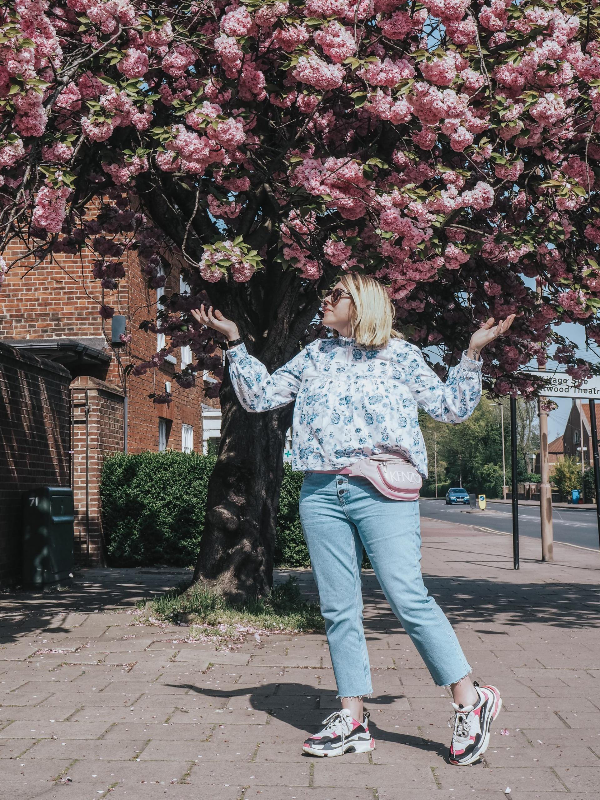 I love this time of year. The temperature is just warm enough for a light jacket and sometimes even bare legs. As the blossom trees are also in bloom just around the corner from our house, I thought I would capture some pictures of me, the blossom girl.