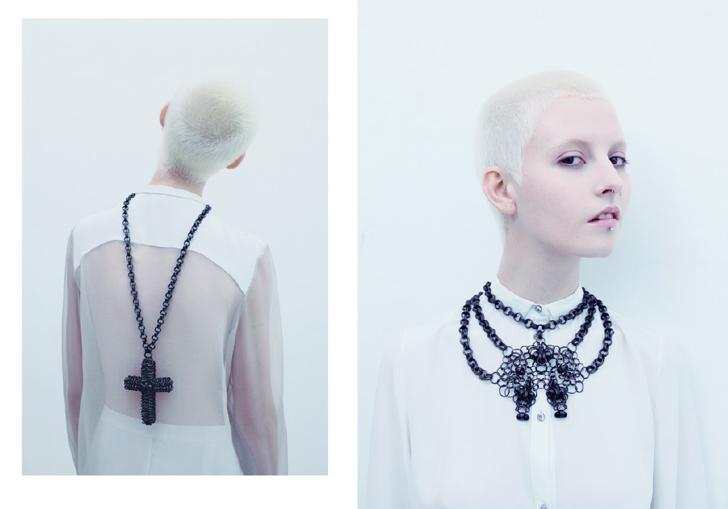 I normally get rather excited when a new look book lands in my inbox but when I saw Fannie Schiavoni’s collection, I was particularly foaming at the mouth. With Jewellery that sculpts and hugs your body and acts more as an outfit or uniform rather then an accessory, I think Fannie is going places. With her leather and chain inserts and slight hints at religious inspirations, the new collection is very appealing, striking and above all, A W E A R A B L E.