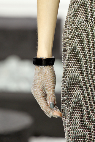 Accessories include the signature branded cuffs in metal and clear perspex, yellow clutches, traditional quilted Chanel bags in the new season colours, block style sandals with a slight oriental feel and pointelle leather gloves and Wedge boots. The effect has even been used on a pair of white trousers which works effectively.