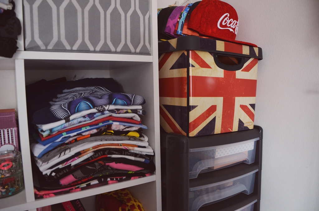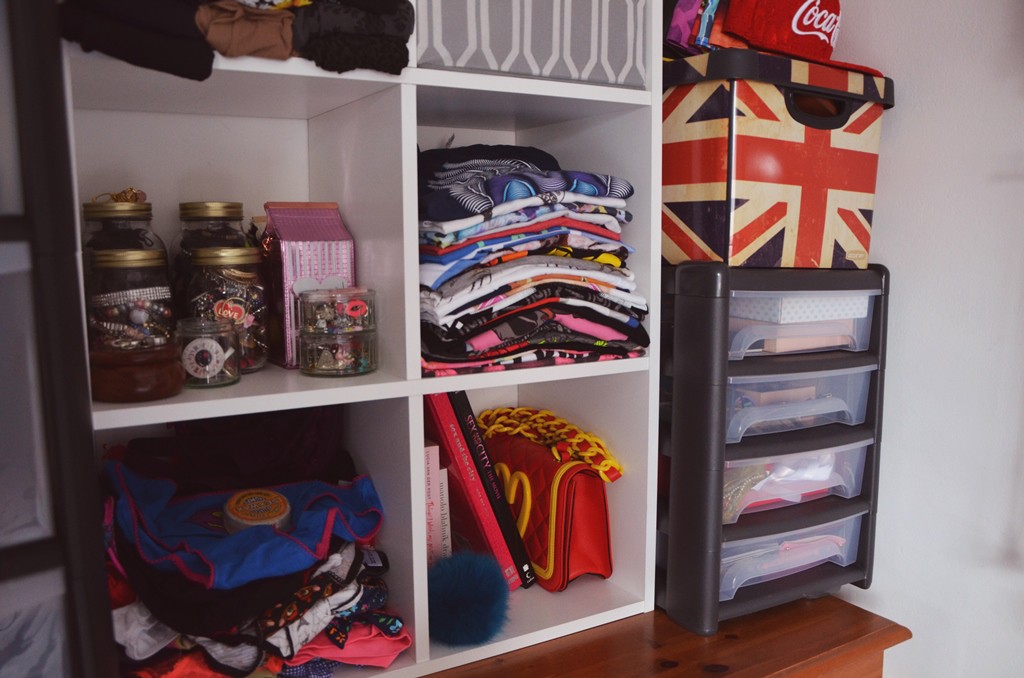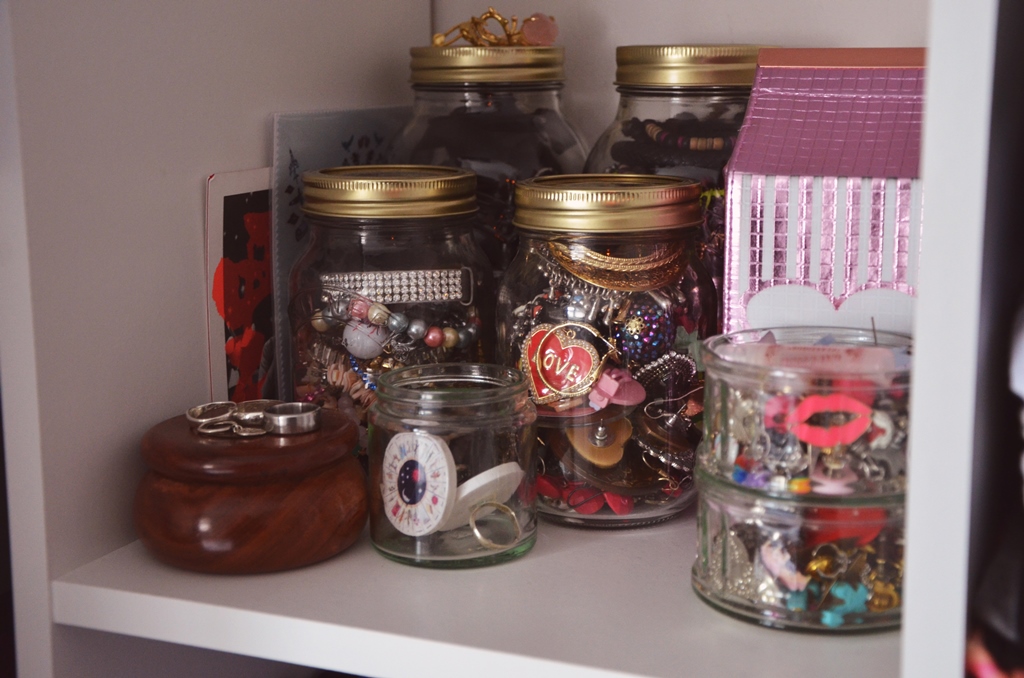 We have a fairly small room and once the double bed has marked its territory, there isn’t a huge amount of space for anything else! As I had to give up having my own draws due to us having to move the room around, I opted to buy these great shelves that are easy to assemble and affordable from Argos. With the option of buying storage boxes also, I moved all my jewellery, underwear, tights, gym gear and other random things to these shelves and now it is so easy to access anything I need. I also bought these great Kilner jars from Sainsbury’s which I use as storage for my jewellery and I love the retro Vintage feel they give to our room.
