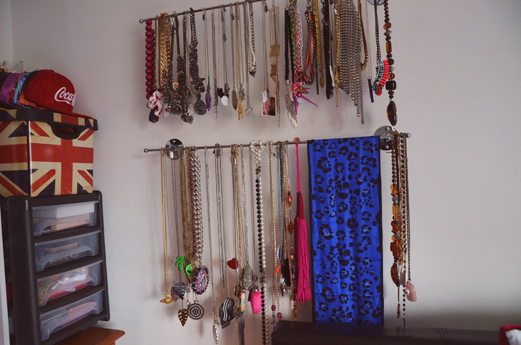 Necklaces were a huge problem for me and as I have so many they would end up being hung on door handles, hangers and anywhere that they didn’t get tangled up. After trying to come up with a solution, we had a little wander around our local Wilkos one weekend and stumbled upon these great towel rails that were only £4 each. They looked pretty sturdy enough and the rails were really easy to install too! Gary just swapped the screws given for some much longer ones to improve on their grib to the wall and after marking and drilling the holes, the rails were up and ready for my necklaces! If you are going to do something simular to this, just remember to cover your bed if you do any drilling near by and have a little hoover up afterwards. This is a great and clever way to store your necklaces and I am so pleased this moment of genius happened upon me in wilkos and for only £4 it is a complete bargain and saves so much hassle!