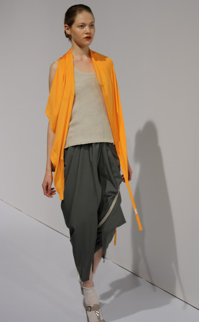 Cristina Sabaiduc‘s  show was a form of Art meets Fashion. With the clothing hung on the wall like pieces of Art, the designer’s team, dressed and styled the models in the new S/S 2012 collection. With acid Oranges, forest greens and floral print, there was a real essence of nature in the colour blocking and a feeling of Earth’s resources. Though the pieces were a little more simple, the clothing took on a chameleon like state, changing to suit the designers tastes or the wearers needs.