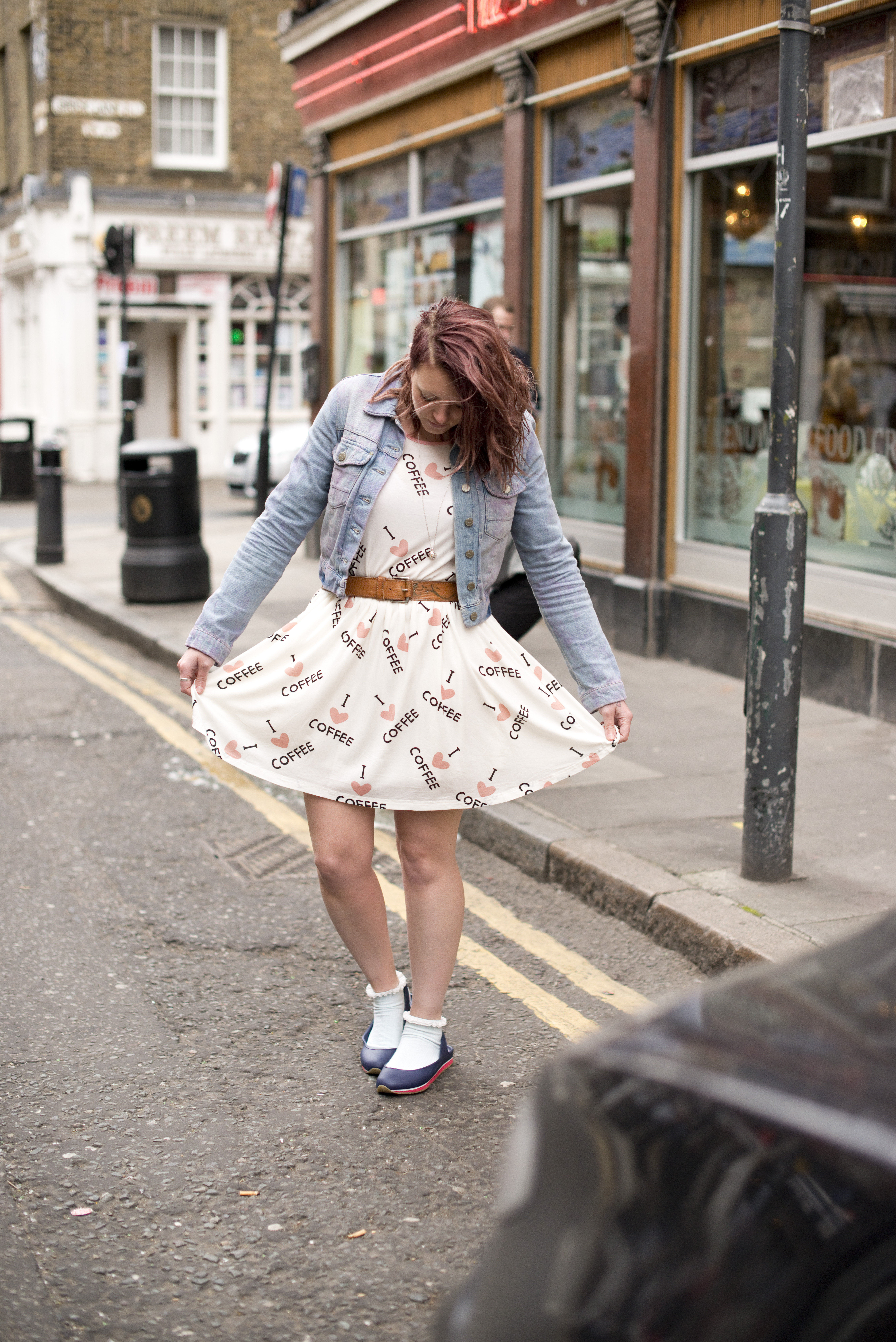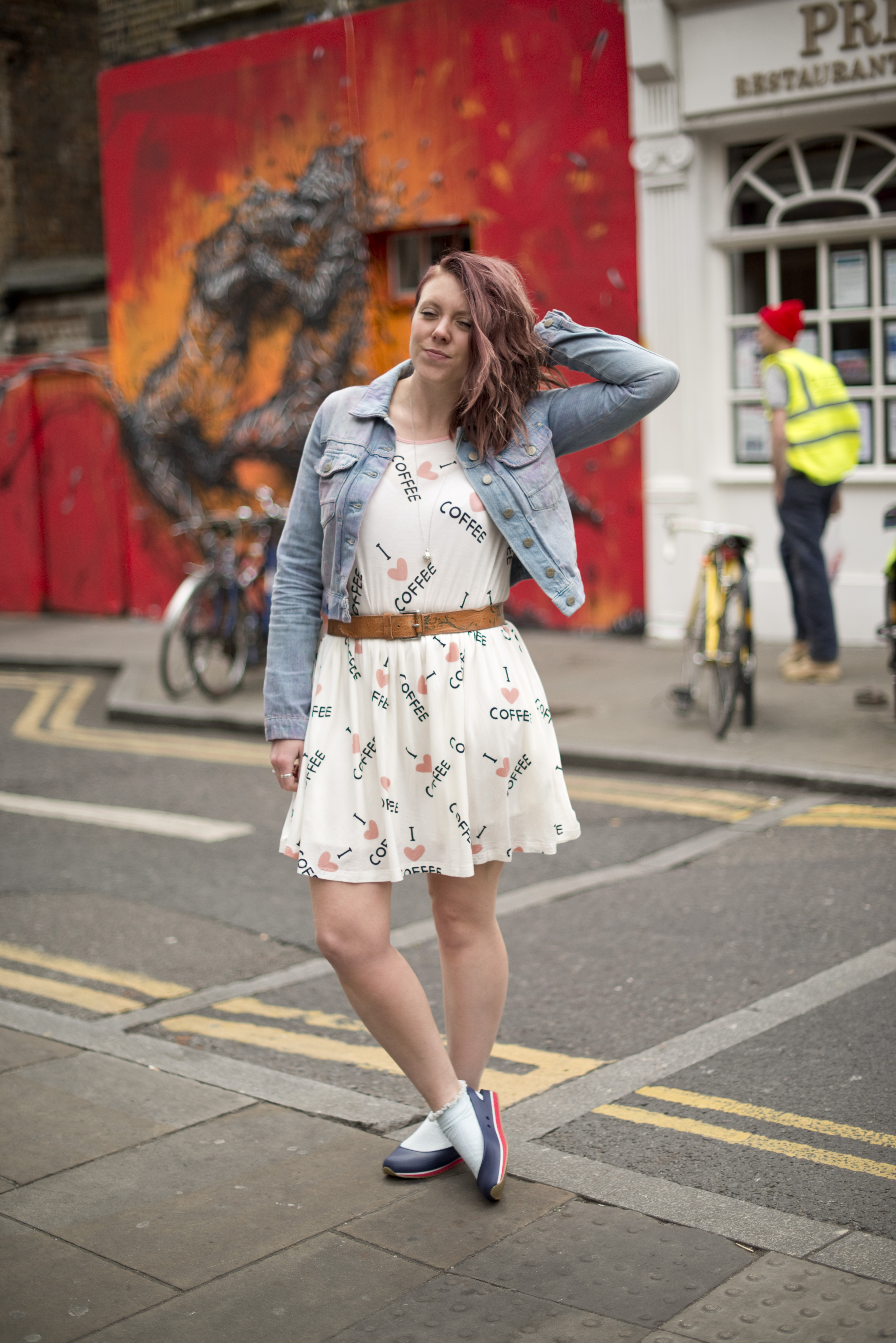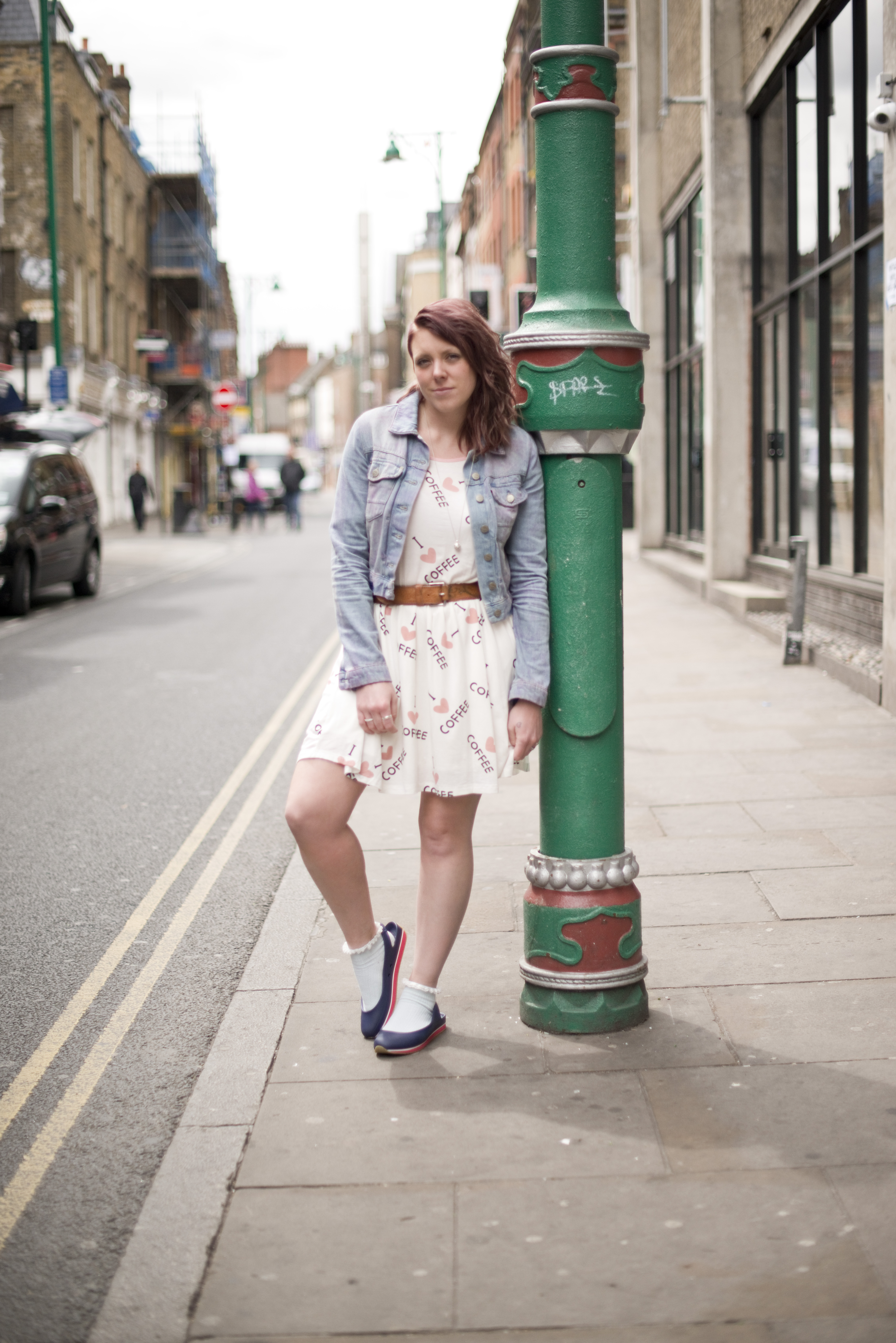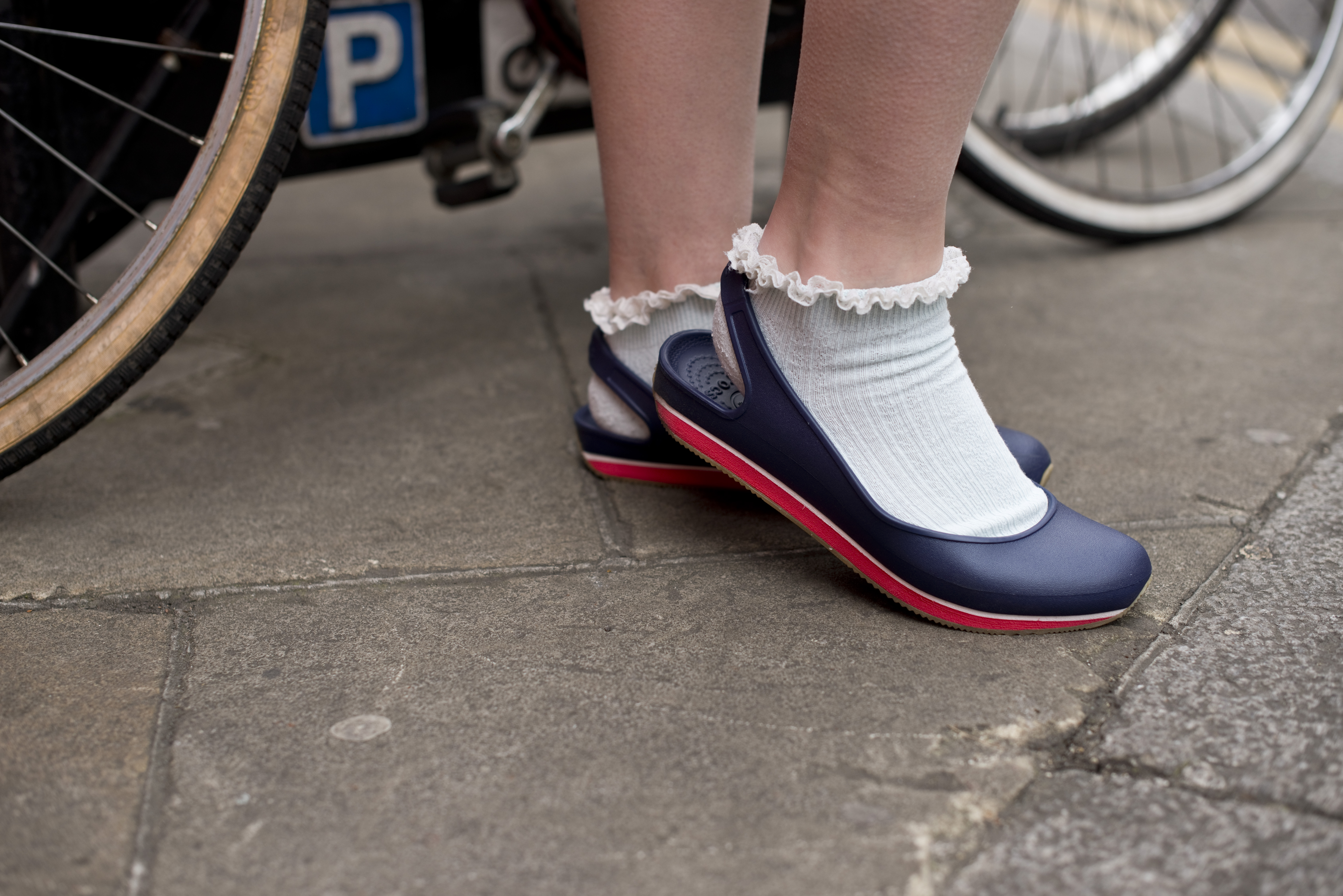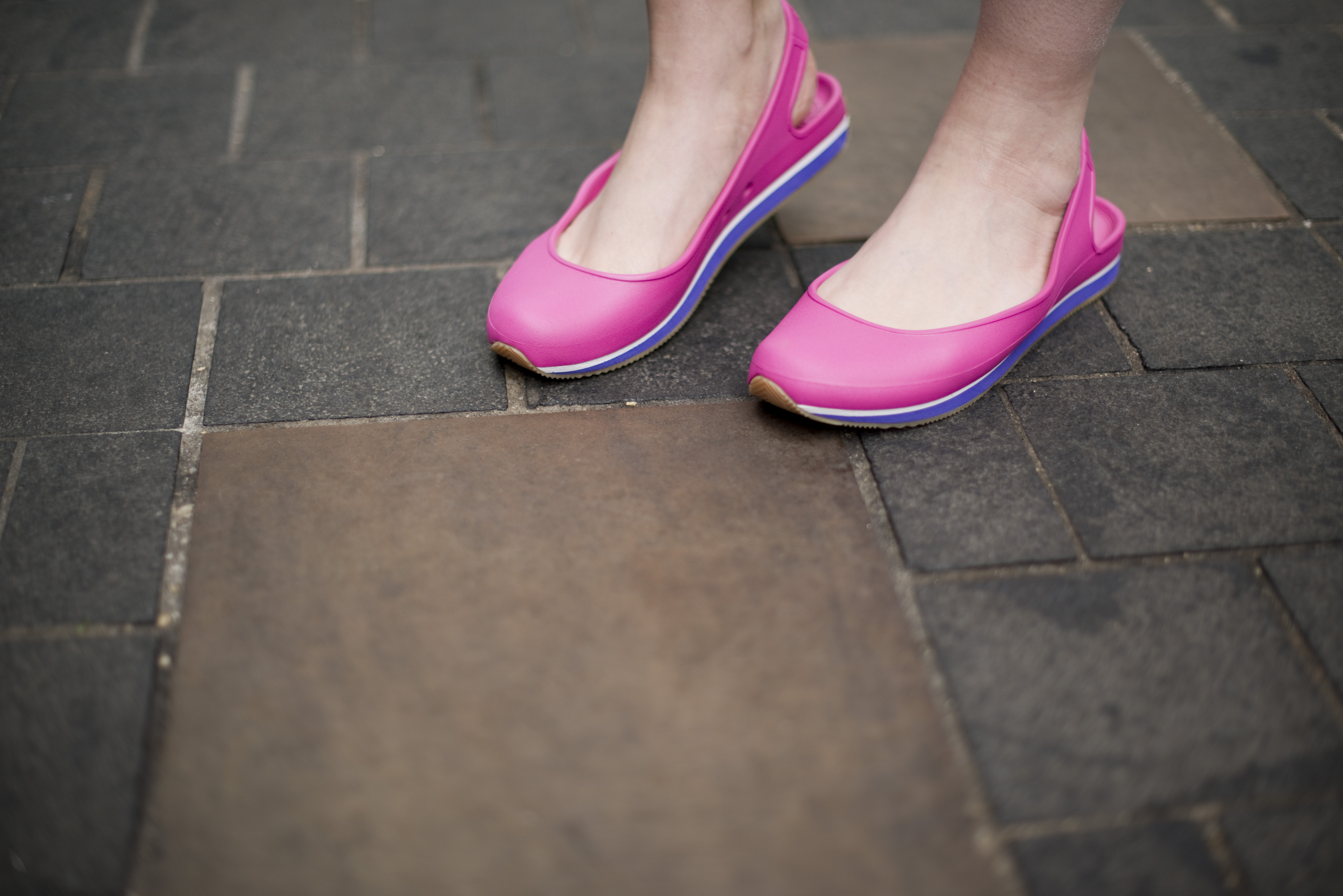 Look 2 and a complete contrast from the street and tomboy look of outfit 1. Wearing a very feminine and easy cotton dress from Pepa Loves, I wanted to show that a girlie and casual style can look great with Crocs Slip on’s in UltraViolet. As well as a soft Topshop denim jacket and vintage style belt from Marc Cain, I thought socks would also make the outfit look ultra girlie and I am happy with the results.