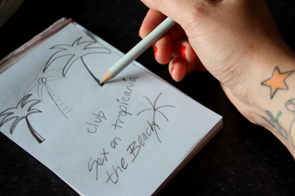 Once I have drawn my palm trees, I then added slogans like ‘Club Tropicana‘ and ‘Sun Dweller‘. I scattered these in various places as I didn’t want it to look too messy and manic.