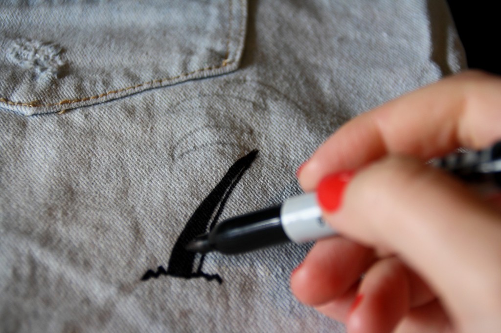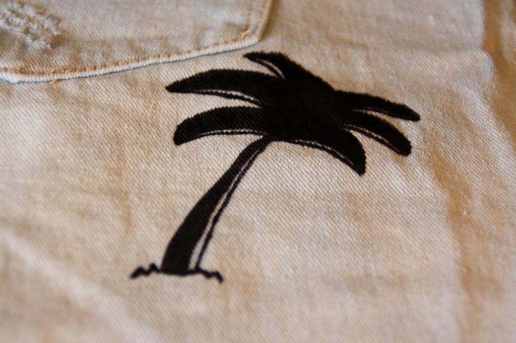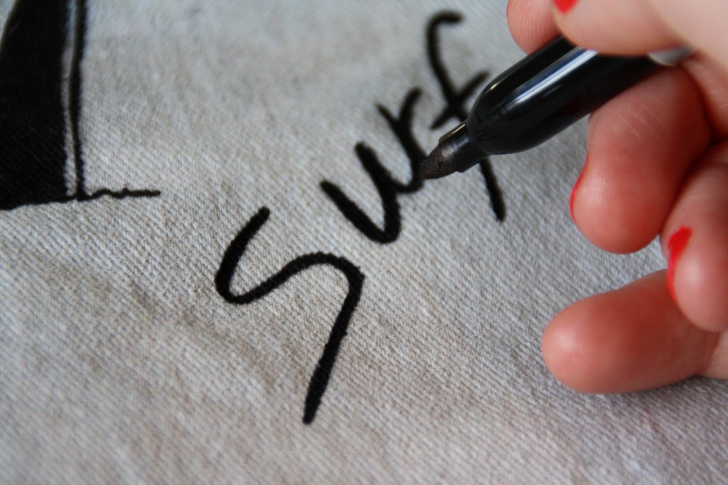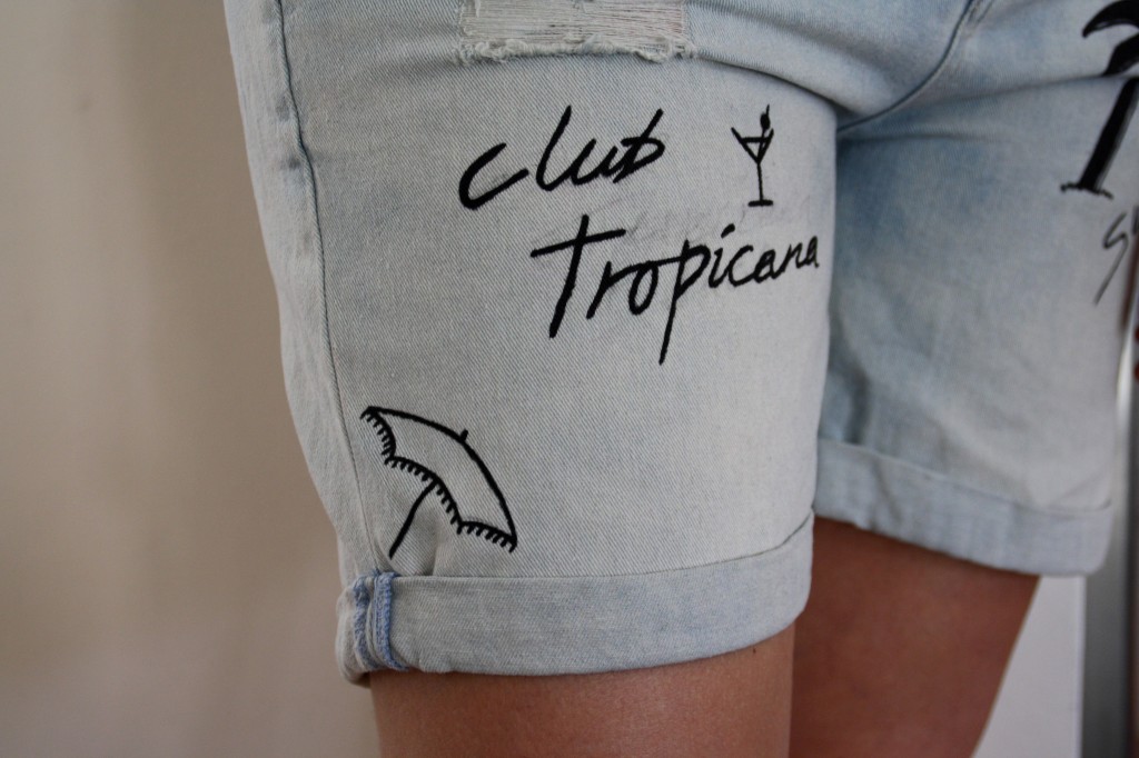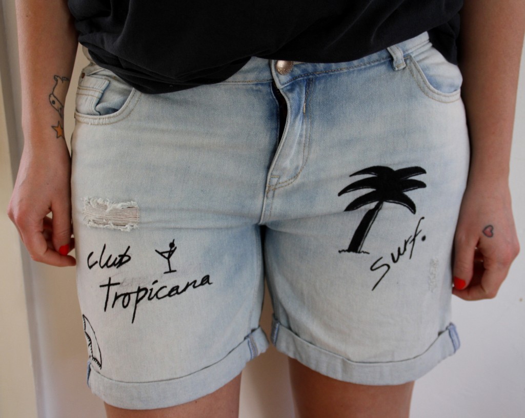 It’s a good idea to firstly stretch out your chosen words and pictures that you want to use as you don’t want to make any mistakes when using the fabric pen. I did practice a few times before I started and I even started by drawing a palm tree on the back of the shorts so I could see that it would come out ok. You can also draw on the shorts with the pencil first so you don’t have to draw free hand.