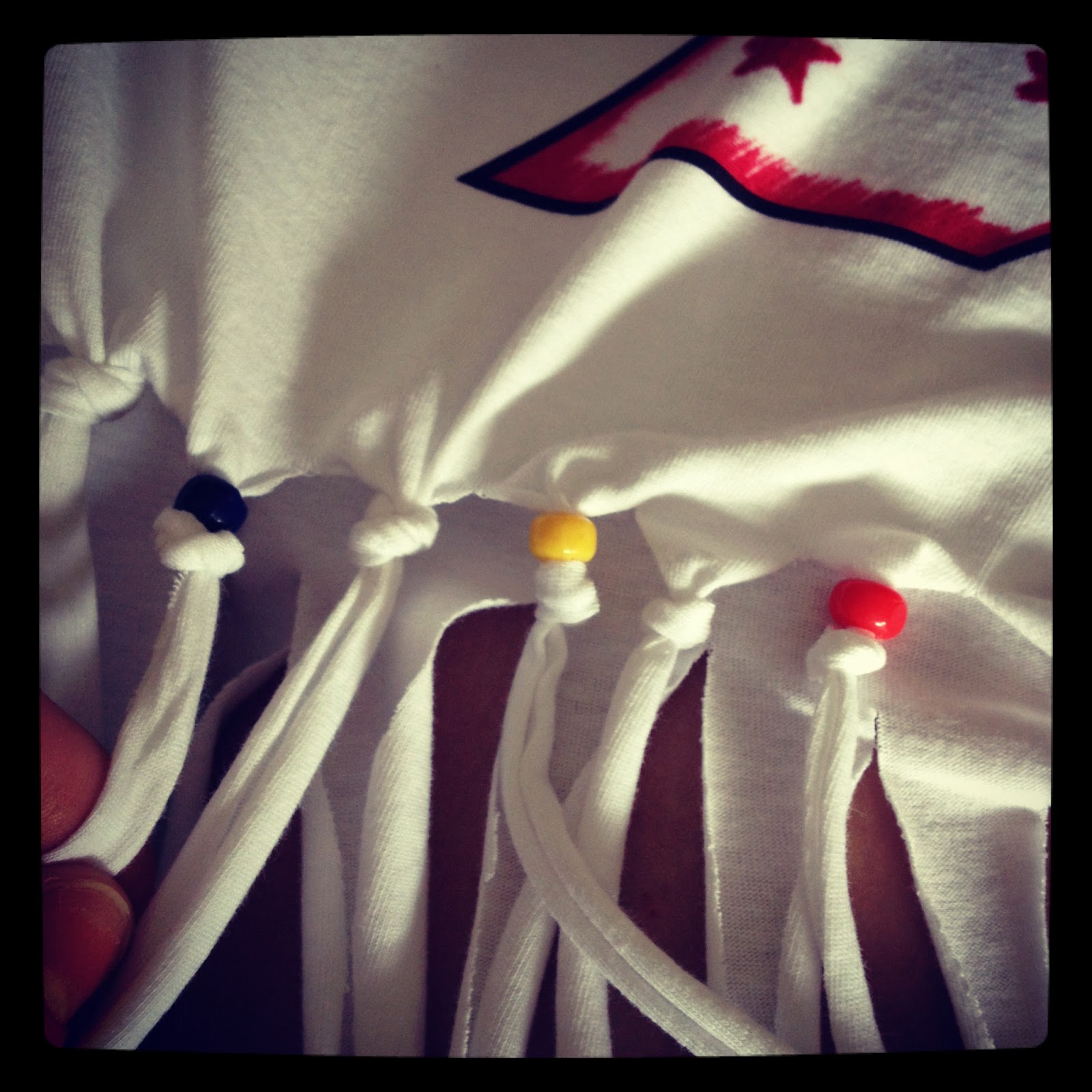 Once the cutting was finished, I used coloured beads (on every other tassel) to add a little more colour. I threaded these to the top of the tassel and knotted the fabric so each bead was secure. I also knotted the ones with no beads as this will ensure the tassel does not stretch too much when worn.