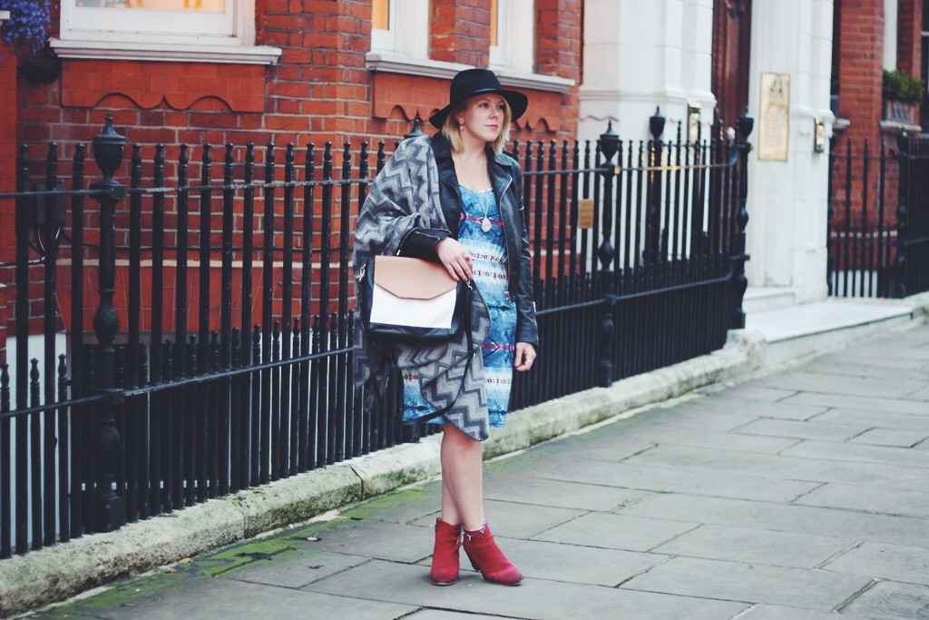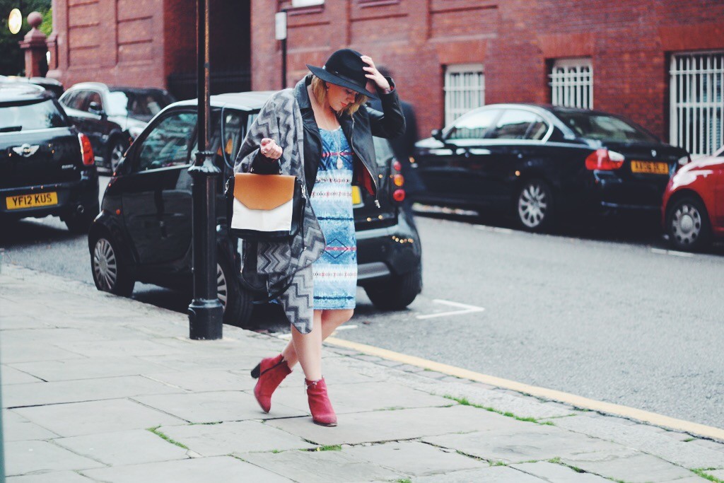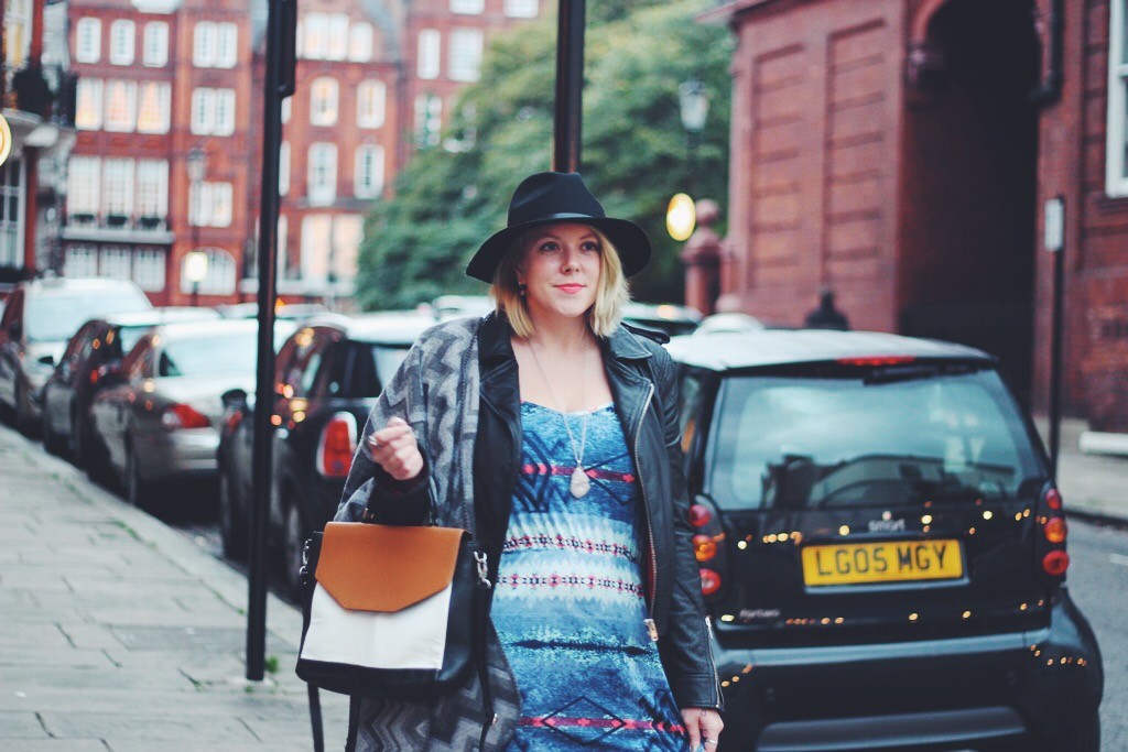 Anyway, back to this outfit! As it’s not yet cold enough for a full coat, I wanted to experiment with this gorgeous cape over this aztec print summer dress. As we are all in the transitional stage with our wardrobes, this look is a great example of how to dress for our changeable weather. I love how it looks with this leather bag too and even though it does look pretty snug, the dress kept me nice and cool and it all works pretty well together!