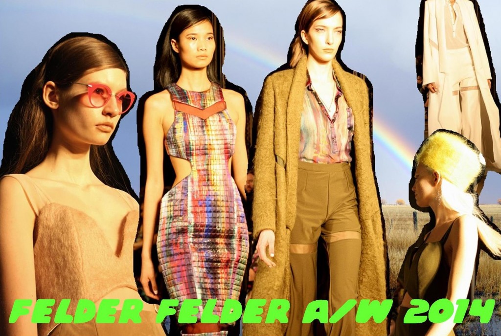Nature and colour has combined their fibres for Felder Felder’s A/W 2014 collection. With a wool or hemp fabric running throughout the pieces, modern injections have been inserted into dresses, skirts, Sunglasses and tops to wake up natural colours that normally can be seen as a little plain. It reminds me of the colours of a moor or valley that is being touched by Rainbow.
