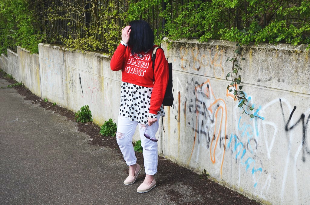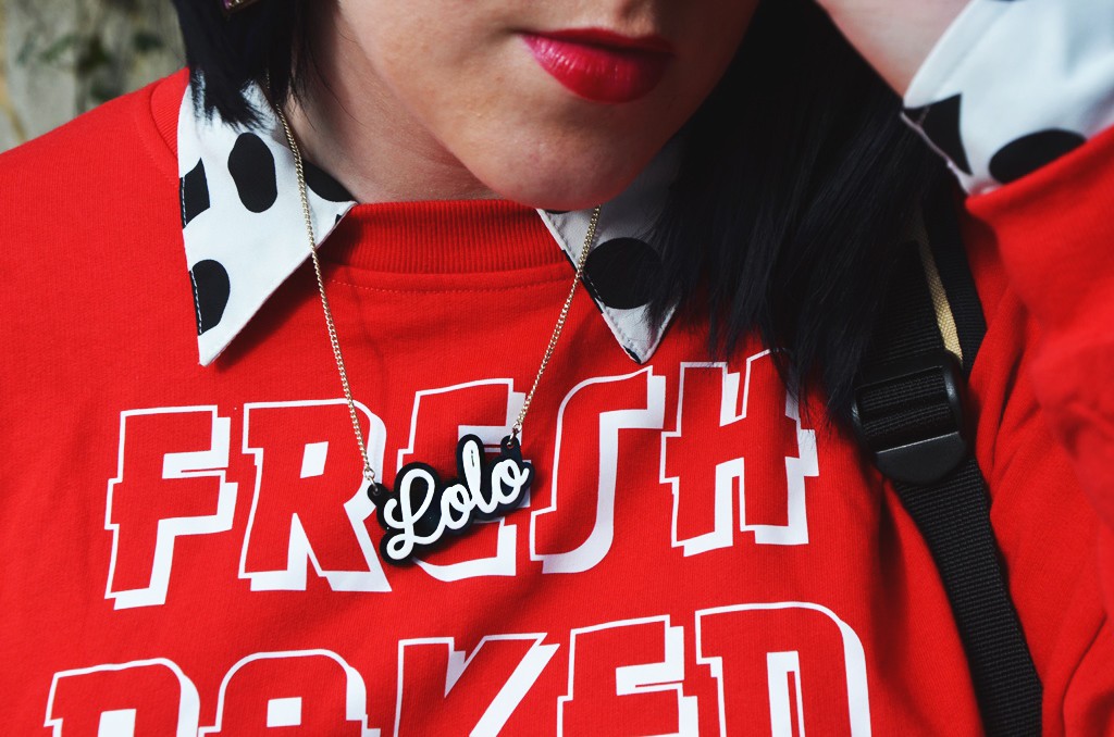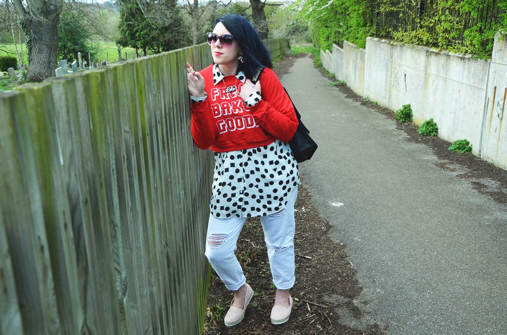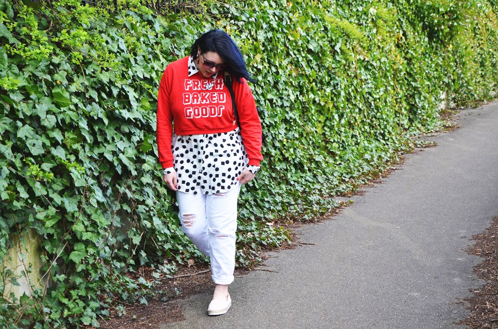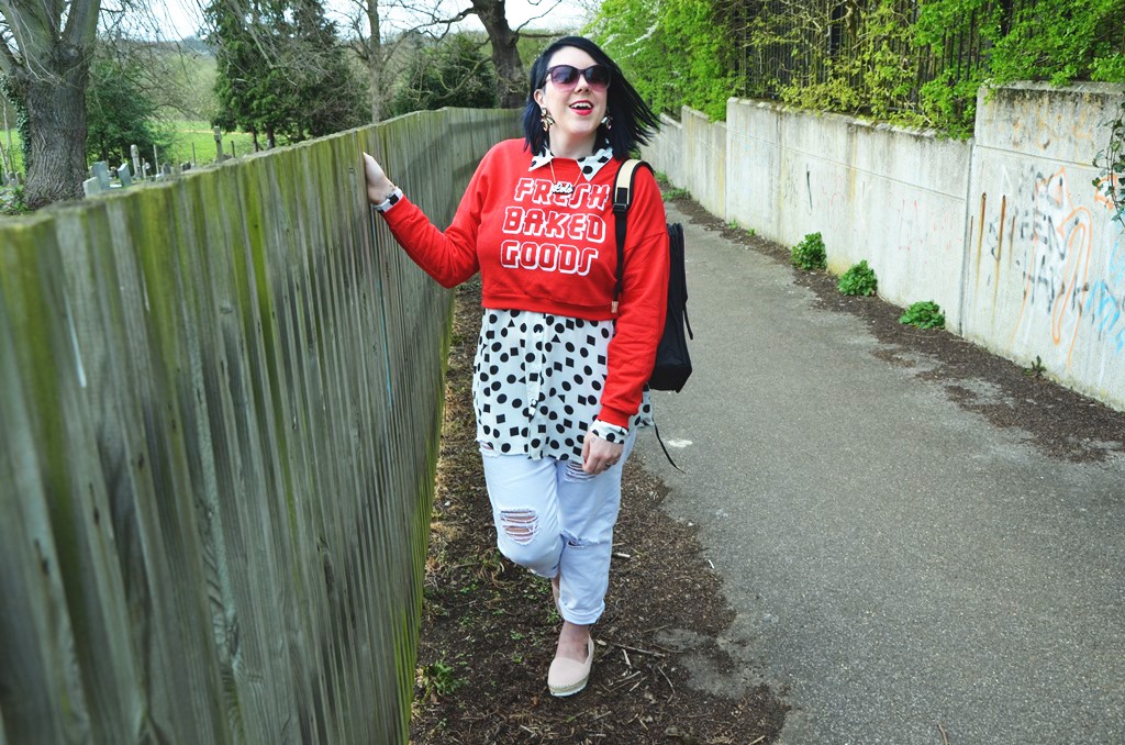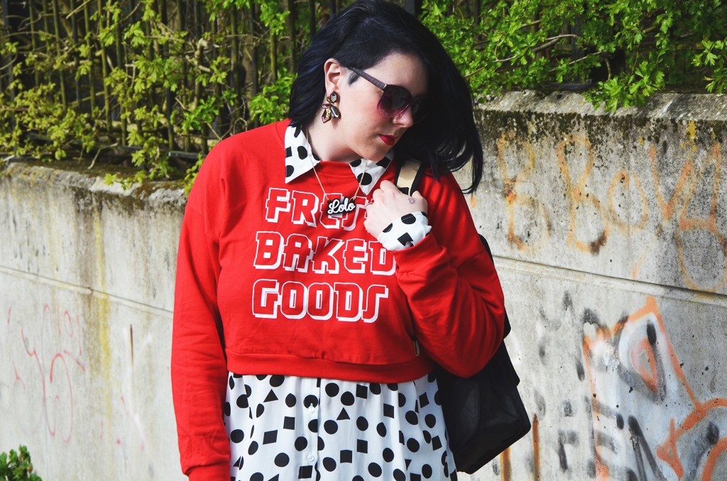 I totally fell for Batoko when I discovered the brand online and I love, love, love their cool slogan tops and fun prints. I do love big statement colours and this red crop sweater is perfect for this warmer weather and for an outfit like this! This Fresh Baked Goods top comes either short or a standard length and there is even a Baewatch print which that is totally rad too!