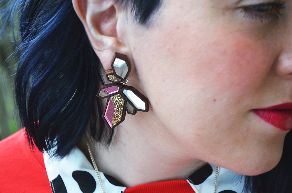 Wolf and Moon do some fabulous jewellery pieces that are unique and very creative. I really couldn’t wait to wear these Crystallized earrings in the pink and I think they look awesome with this outfit. I love the clash of wood and mirrors in this design and the glitter really makes them pop too!