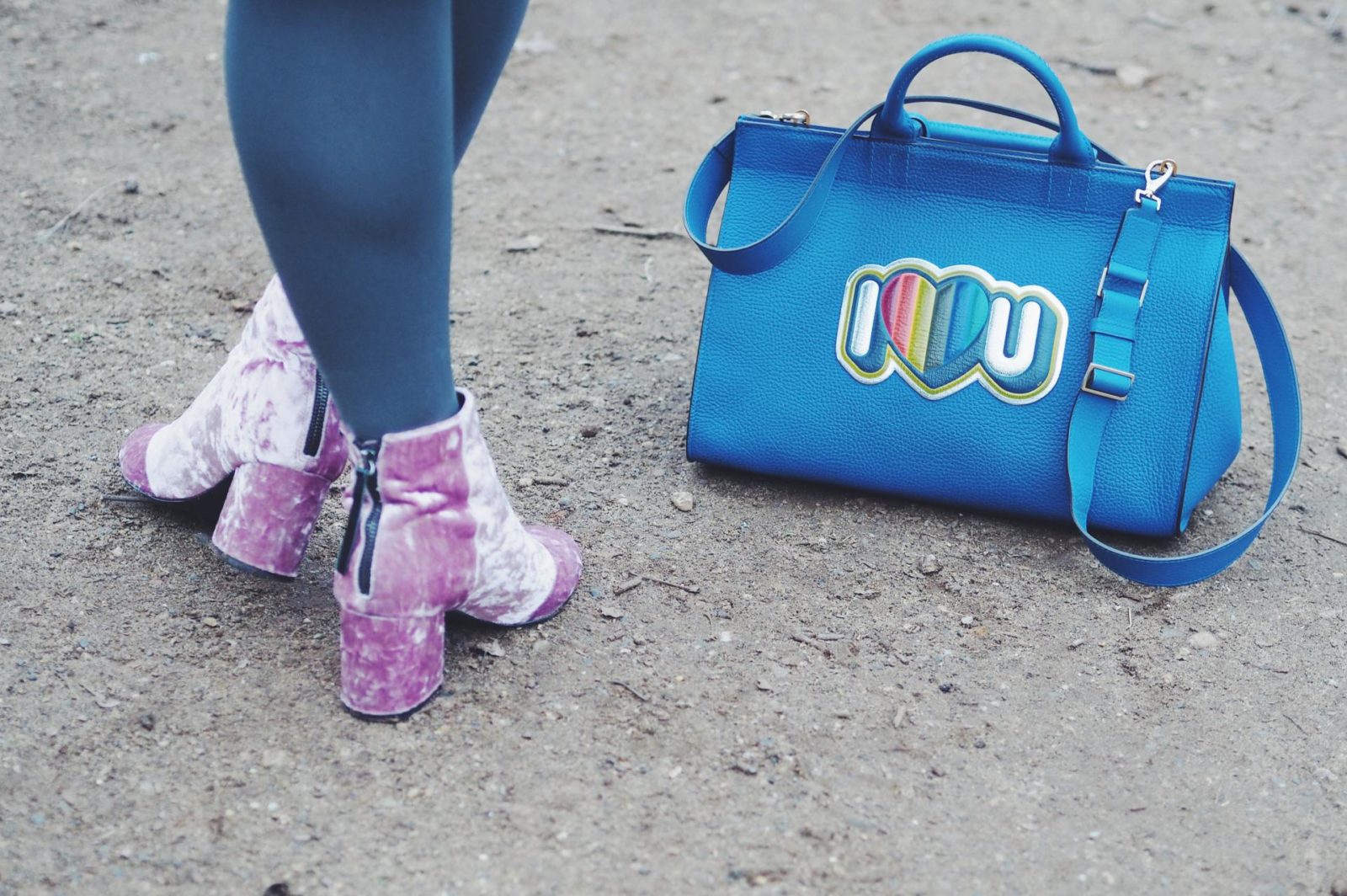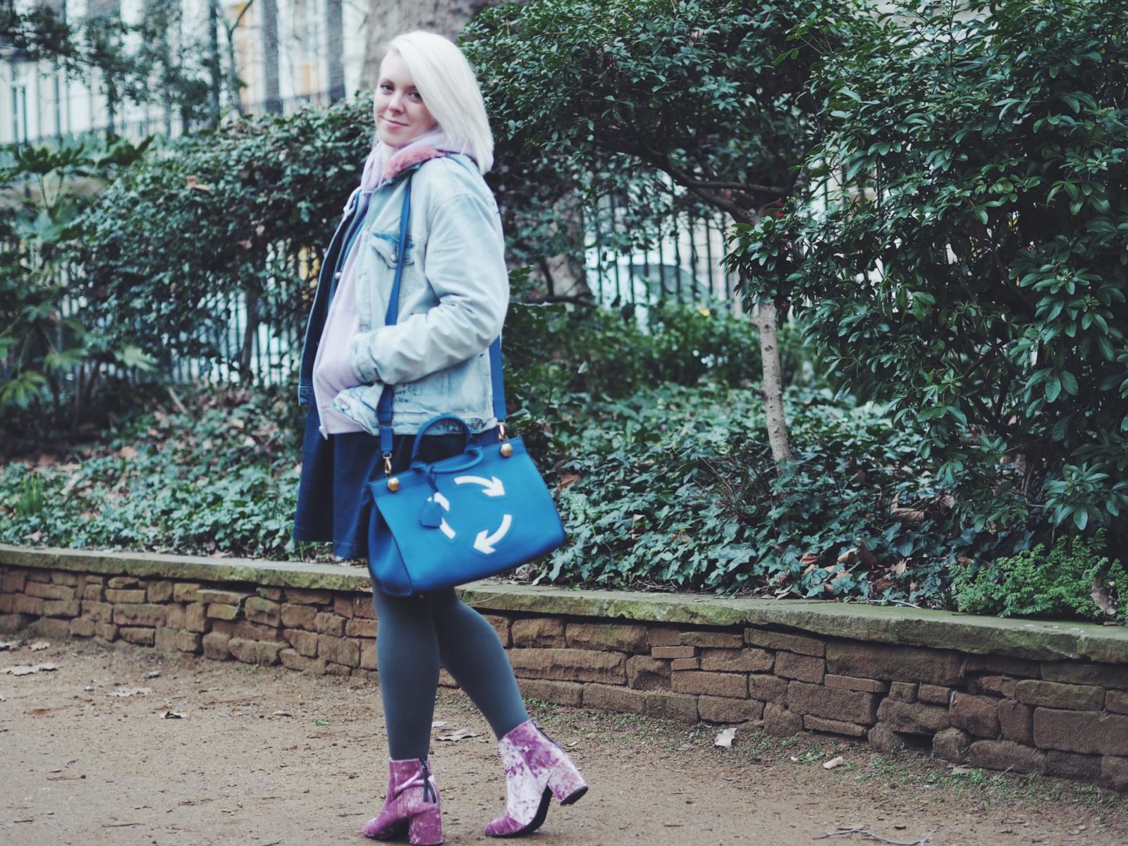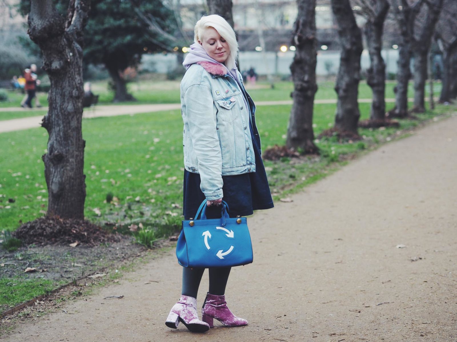 Statement pieces are great when layering with a hoodie so why not try some eye-popping shoes like the velvet ones I am wearing here or carry a real iconic bag which will turn heads and get some stares happening!