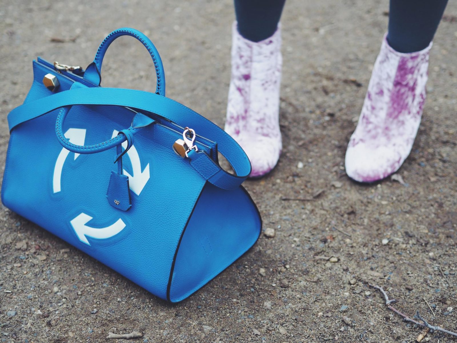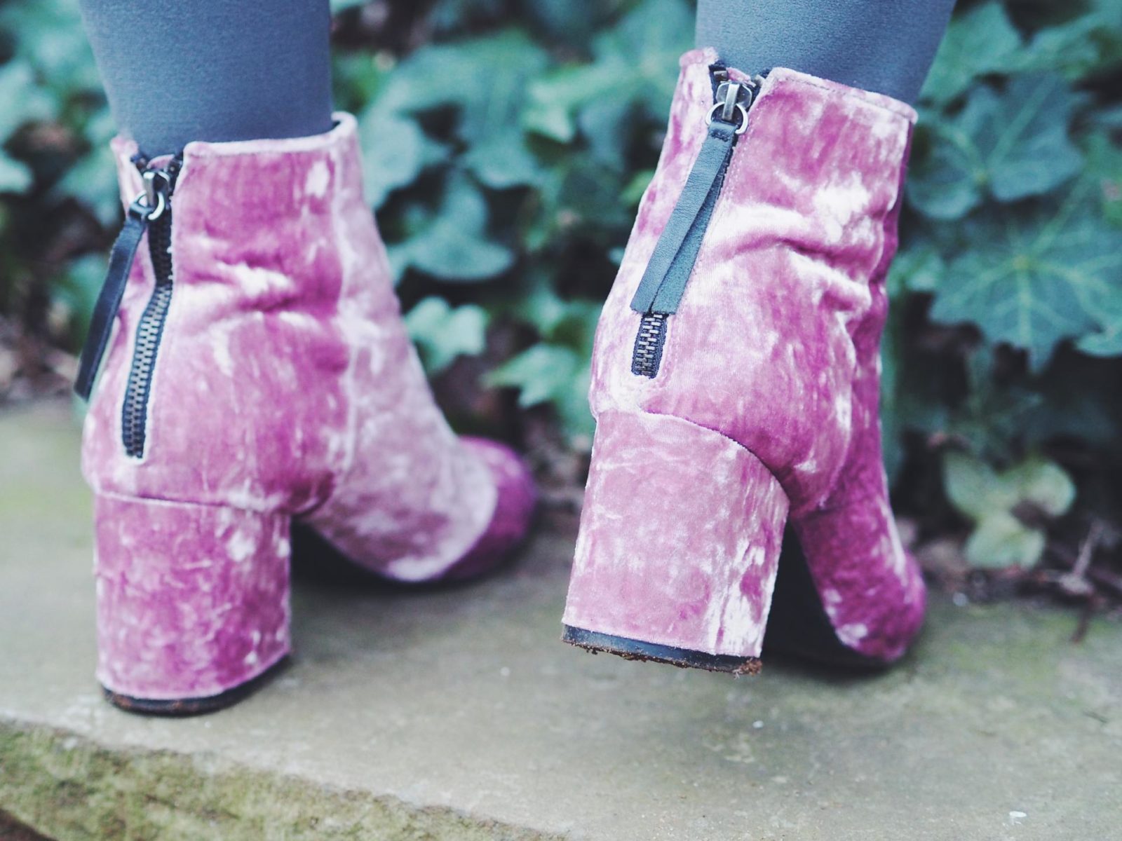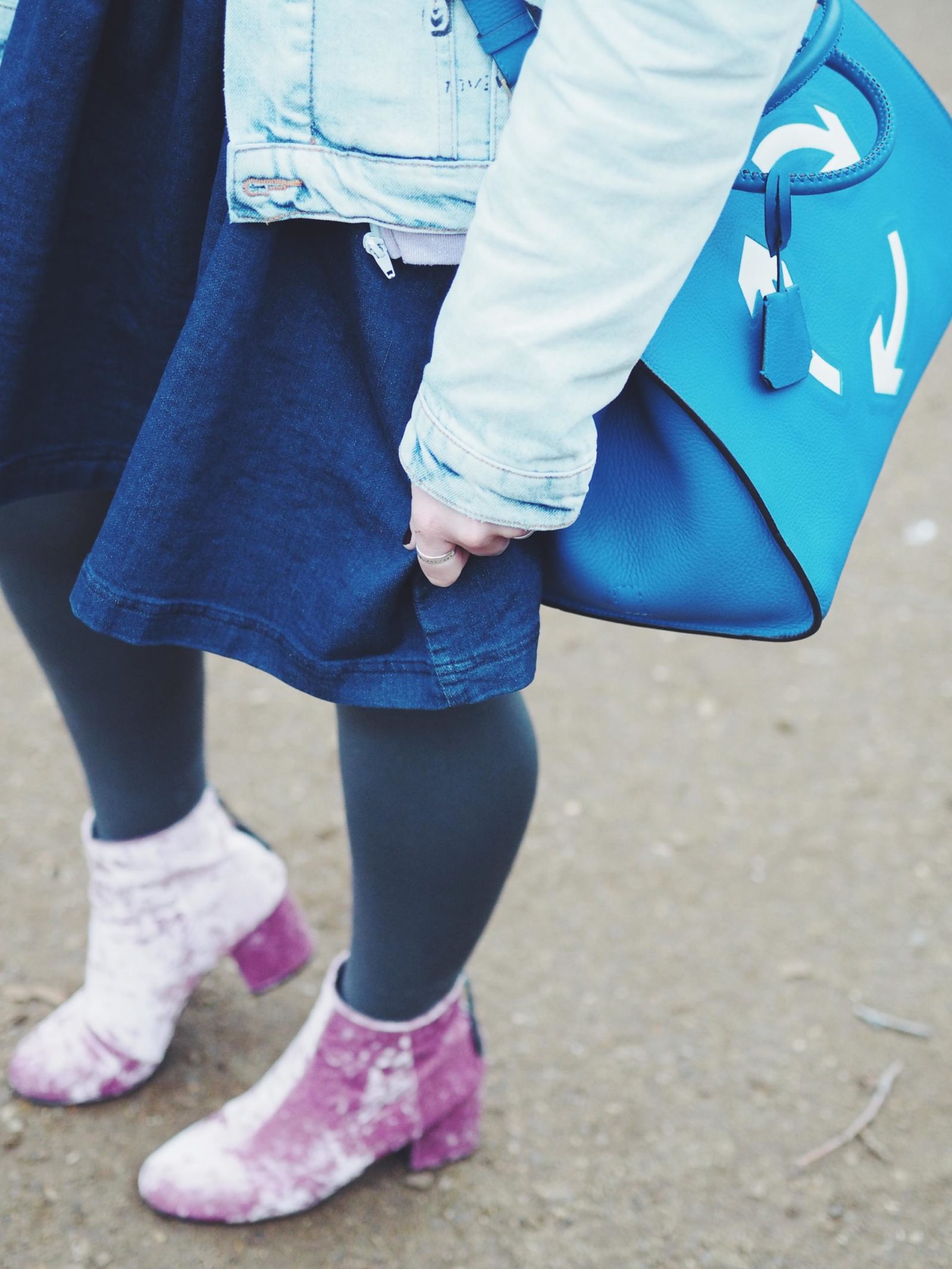 Statement pieces are great when layering with a hoodie so why not try some eye-popping shoes like the velvet ones I am wearing here or carry a real iconic bag which will turn heads and get some stares happening!