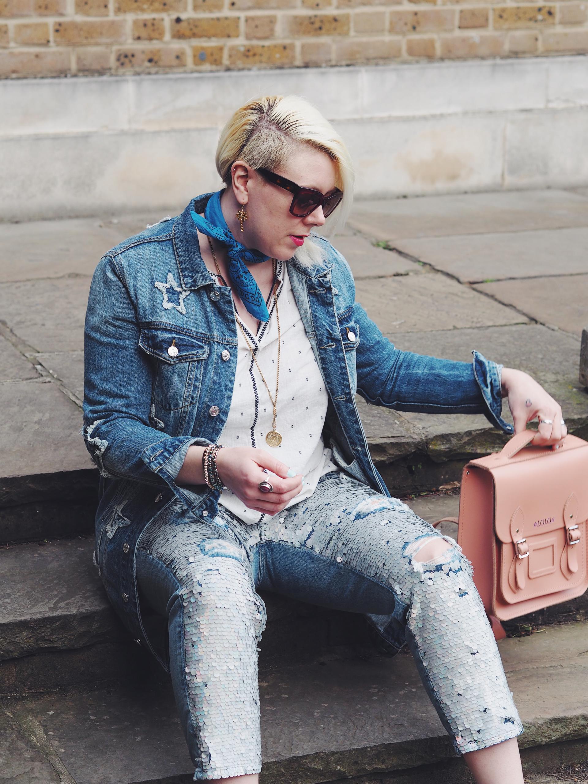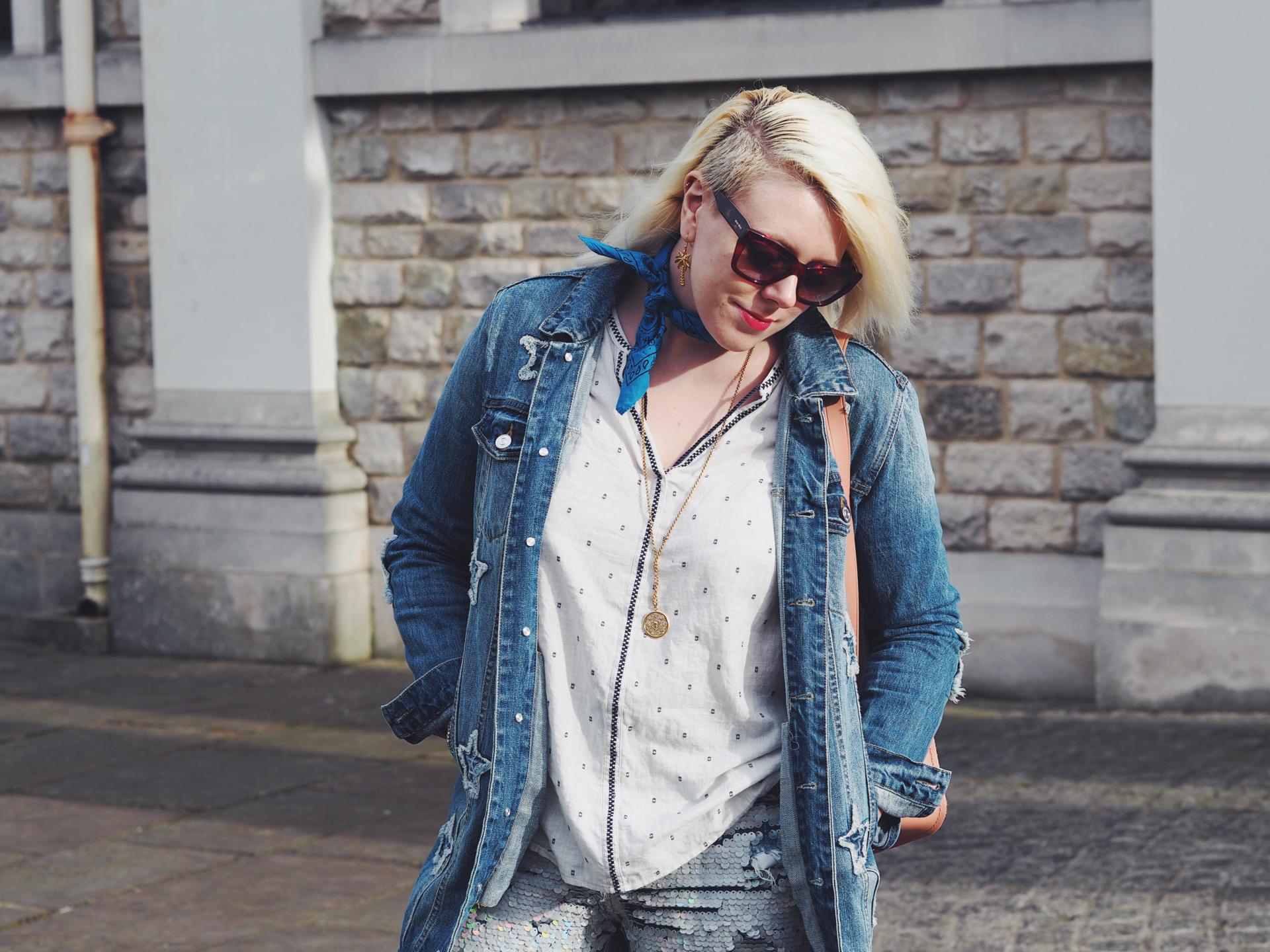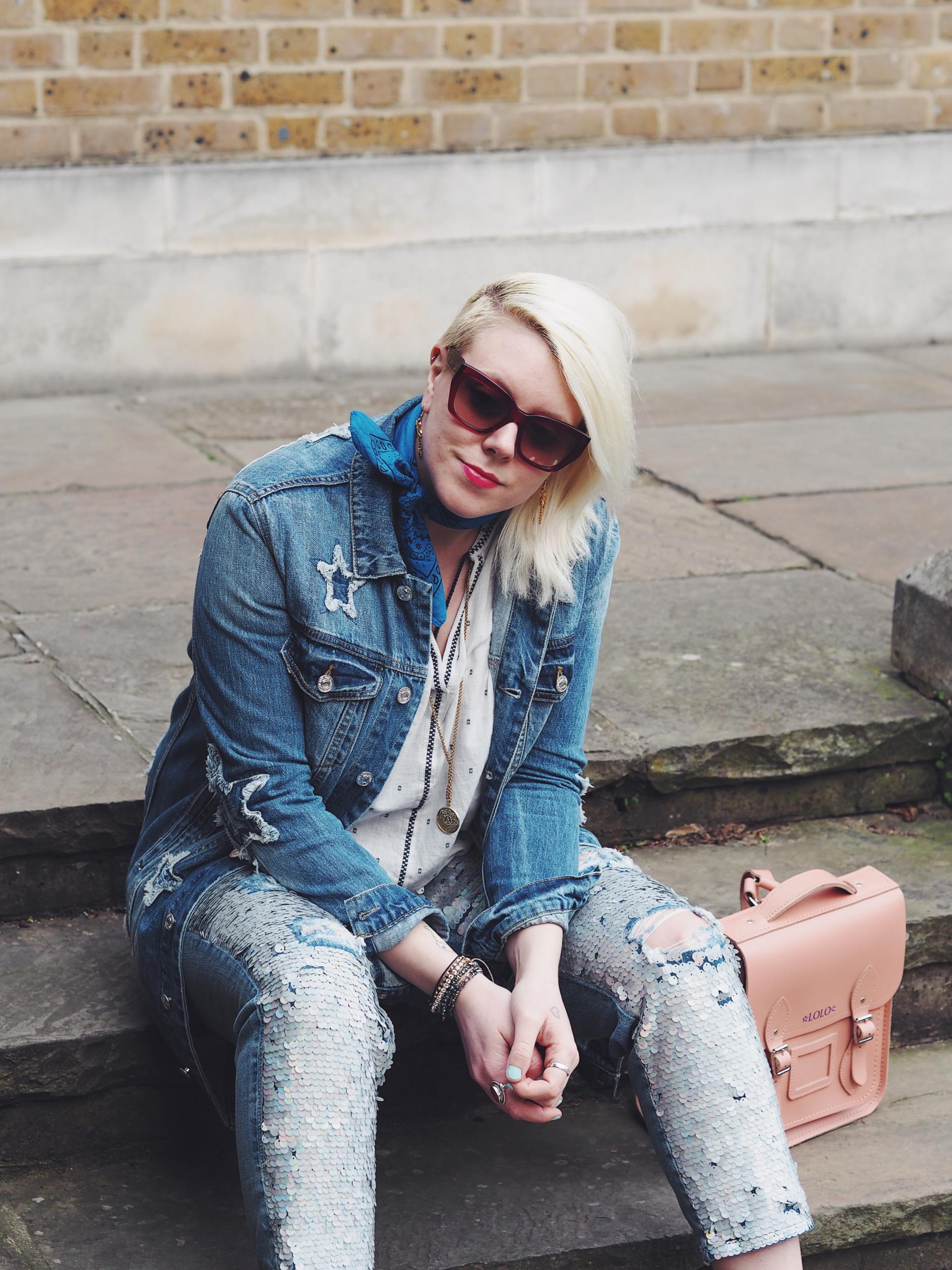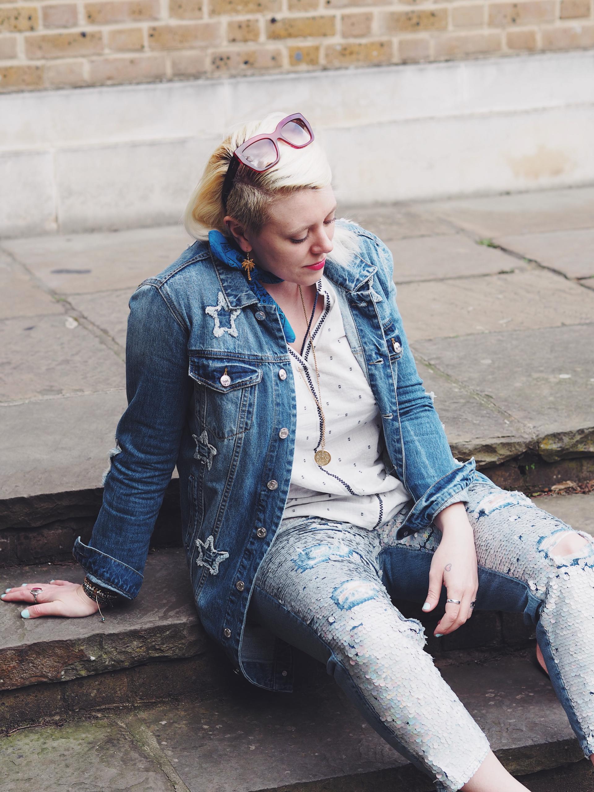 To do this trend with ease, it’s important to choose denim washes that are fairly similar but doesn’t look too coordinated. I think decoration on denim is a good way to break it up and these front sequin jeans from Topshop tone down this trend but gives my outfit a bit of interest and sparkle too. I adore these Topshop jeans when I found them and the cut is a perfect relaxed style for me and my curvy ass.