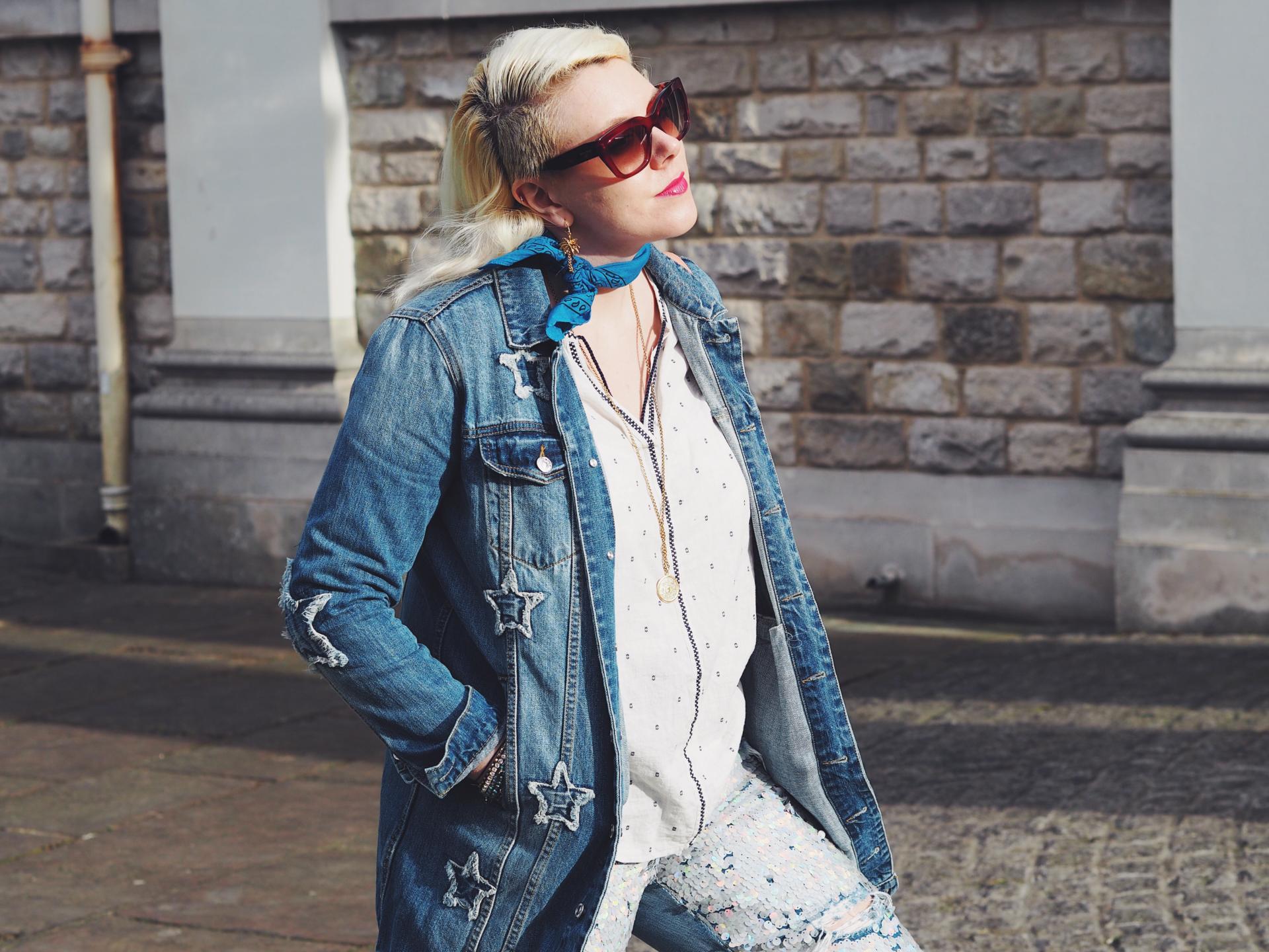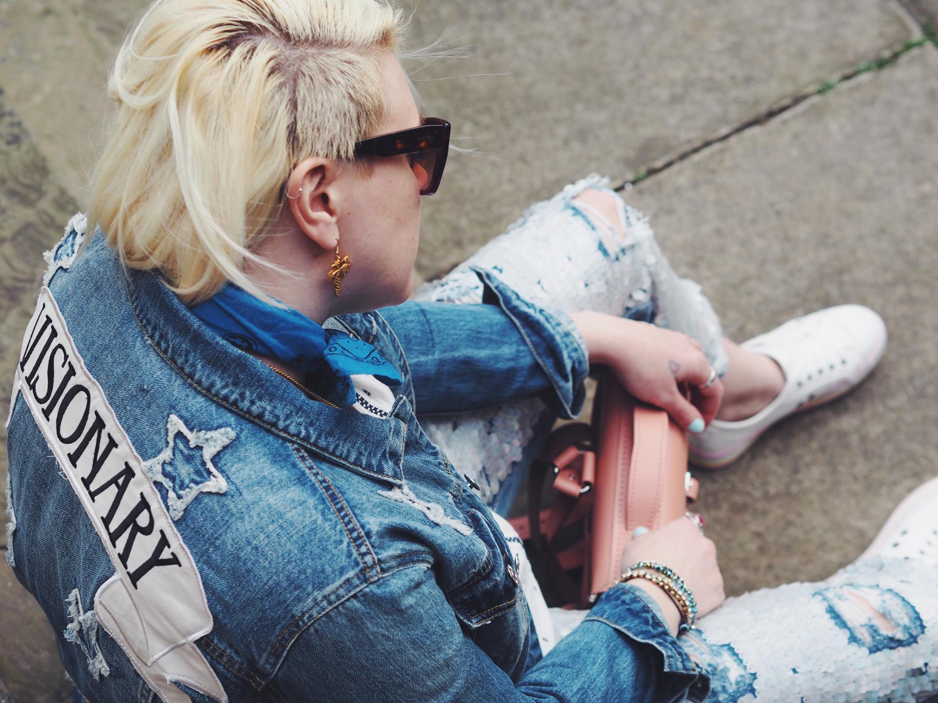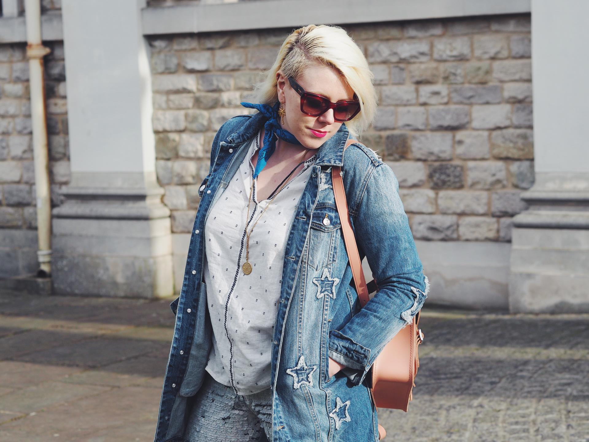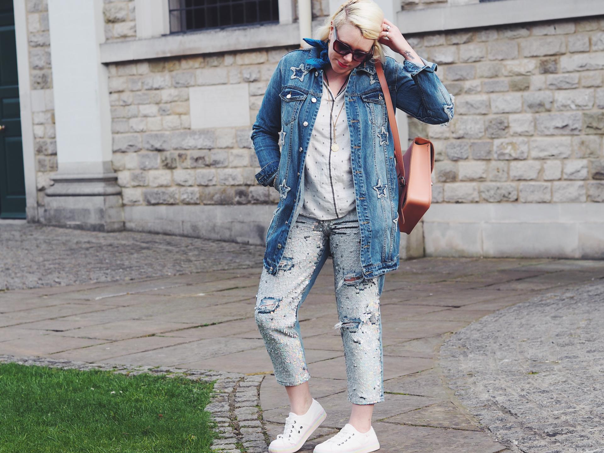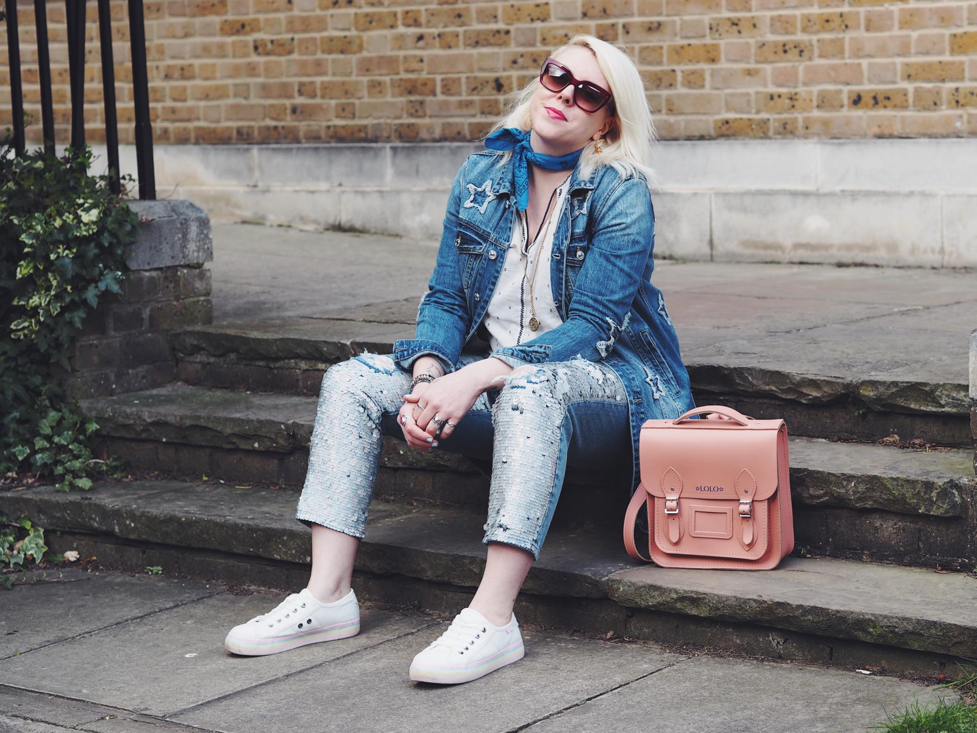 To do this trend with ease, it’s important to choose denim washes that are fairly similar but doesn’t look too coordinated. I think decoration on denim is a good way to break it up and these front sequin jeans from Topshop tone down this trend but gives my outfit a bit of interest and sparkle too. I adore these Topshop jeans when I found them and the cut is a perfect relaxed style for me and my curvy ass.