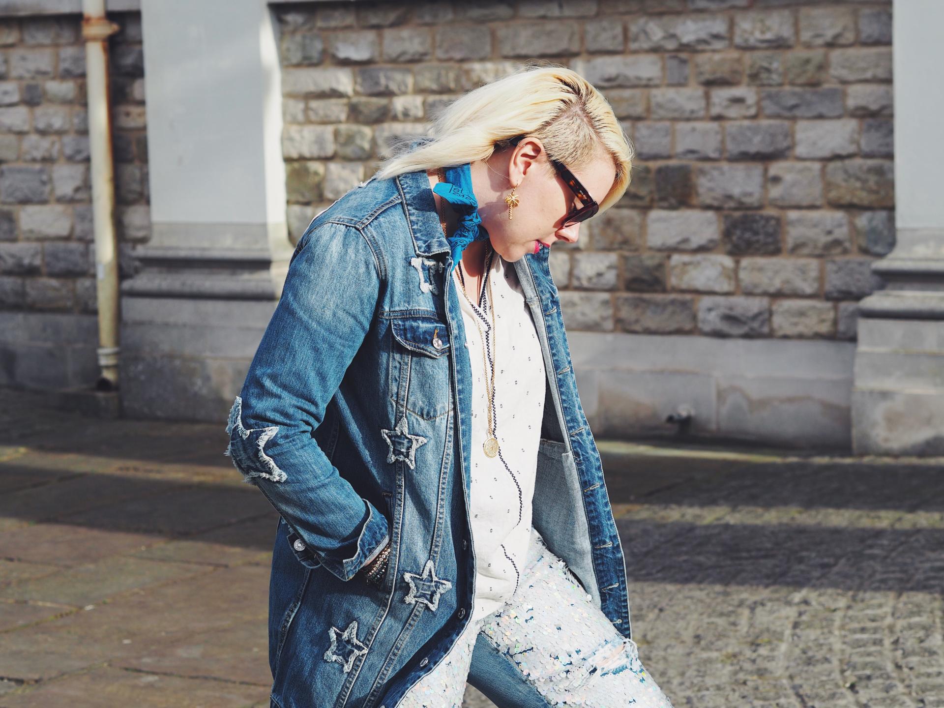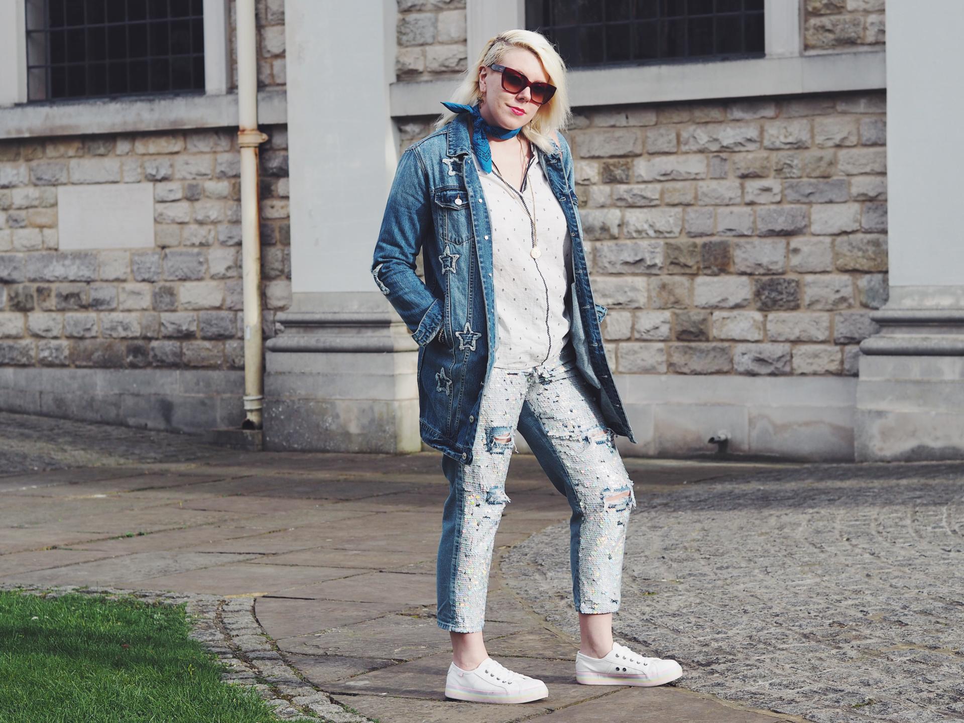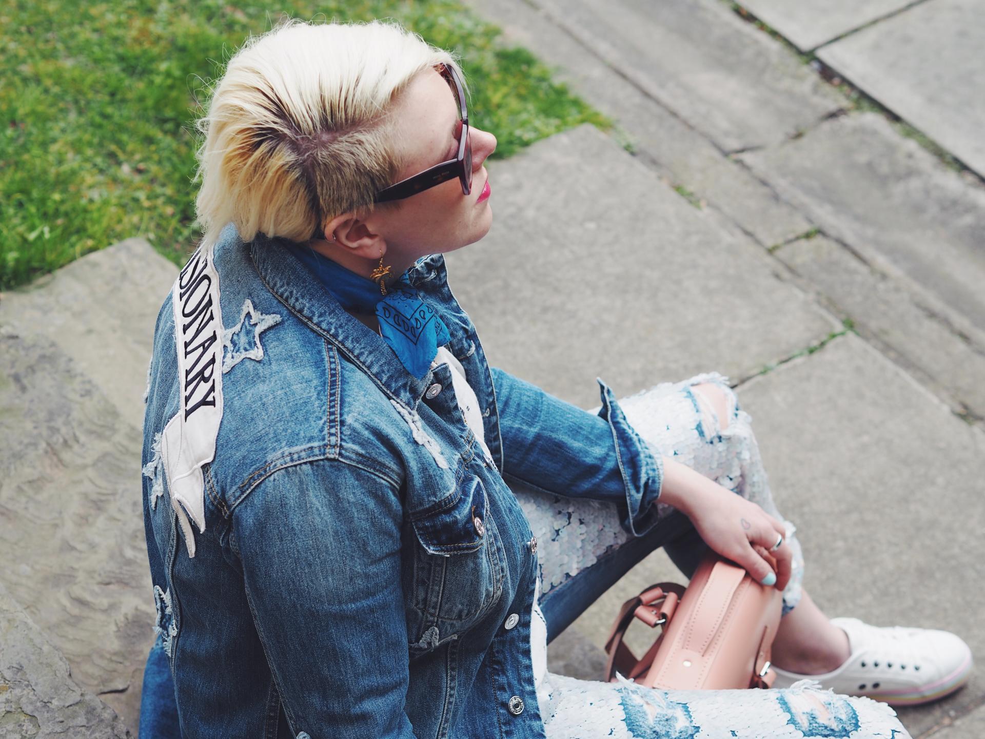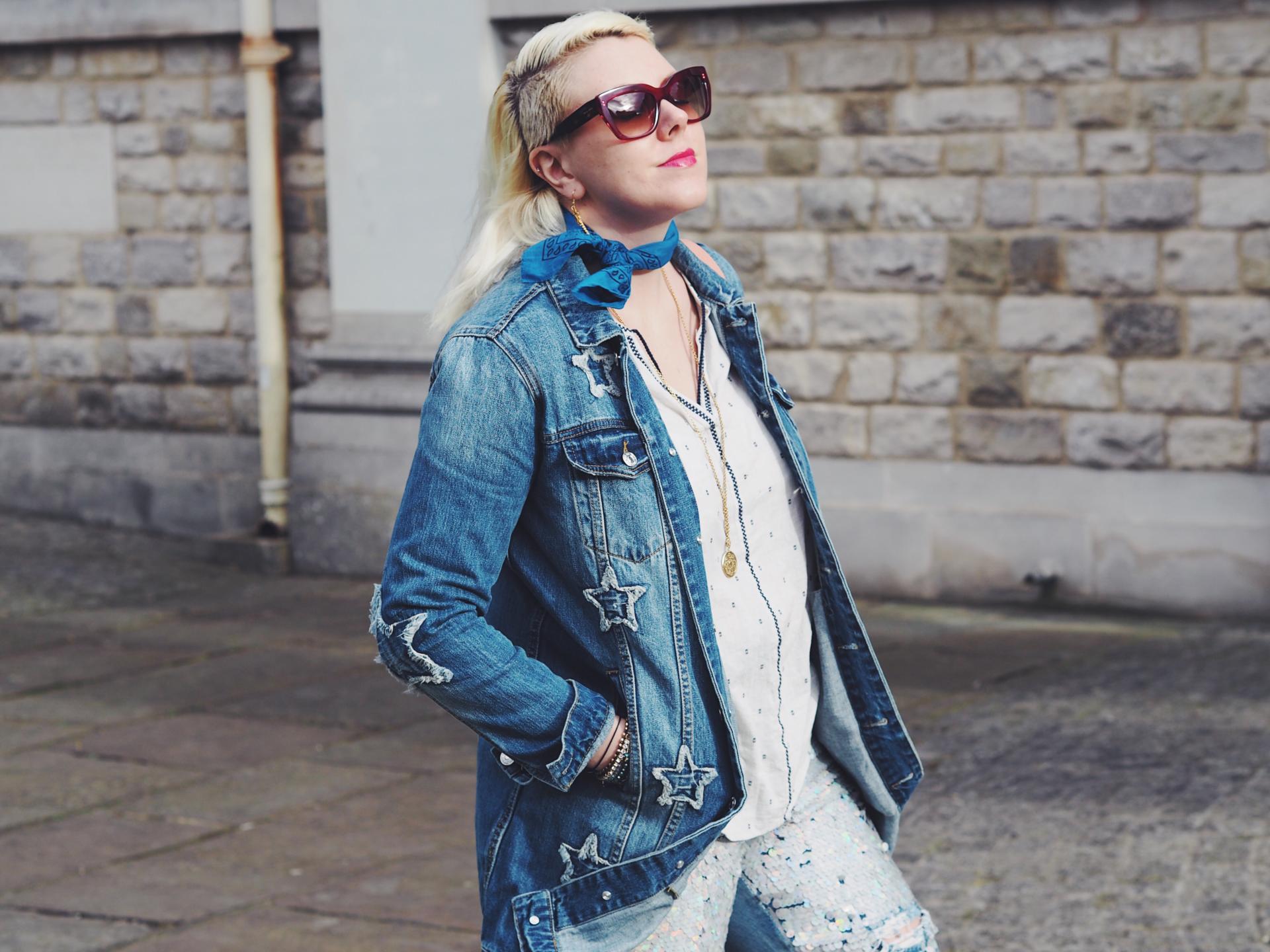 To do this trend with ease, it’s important to choose denim washes that are fairly similar but doesn’t look too coordinated. I think decoration on denim is a good way to break it up and these front sequin jeans from Topshop tone down this trend but gives my outfit a bit of interest and sparkle too. I adore these Topshop jeans when I found them and the cut is a perfect relaxed style for me and my curvy ass.