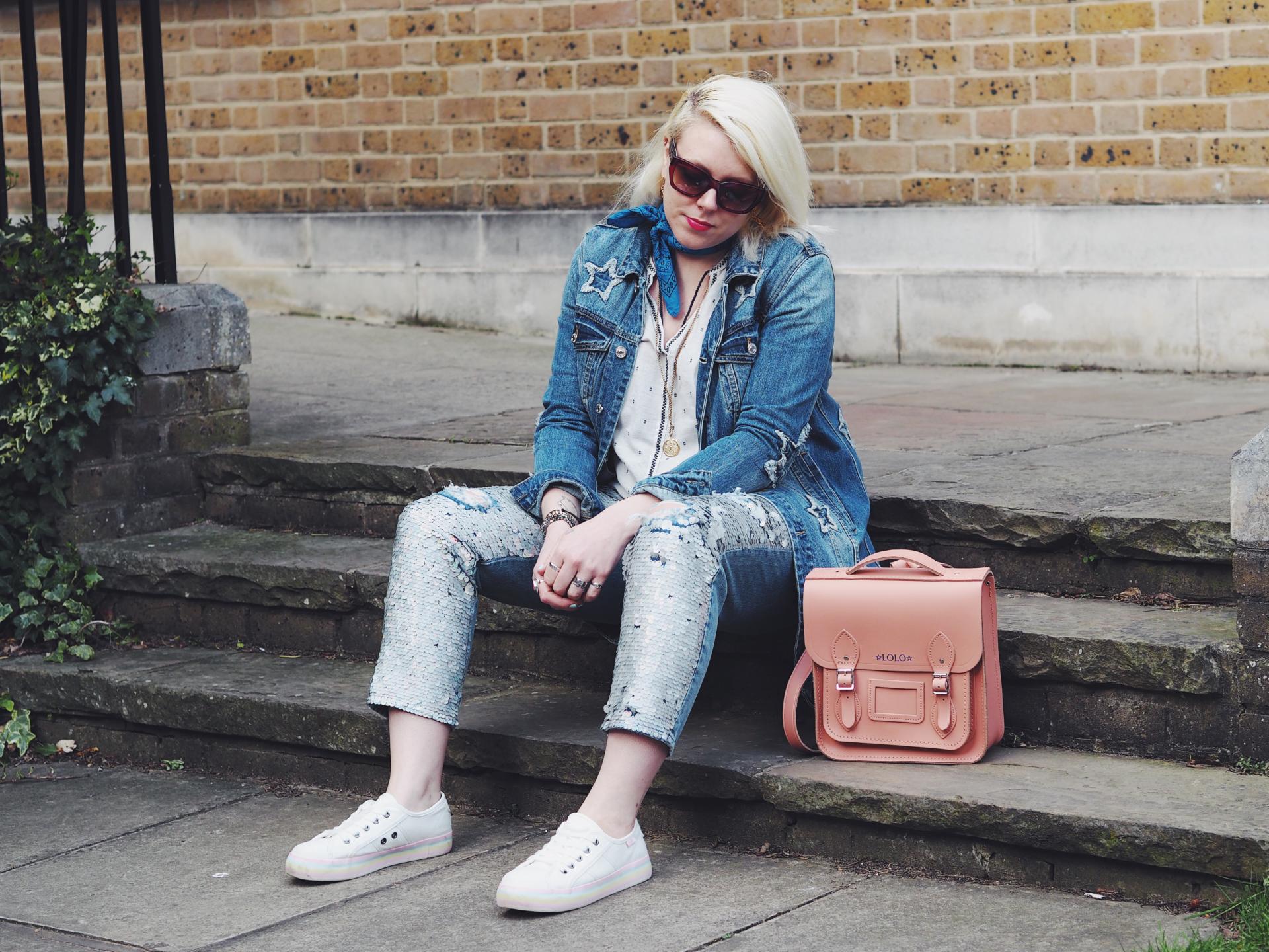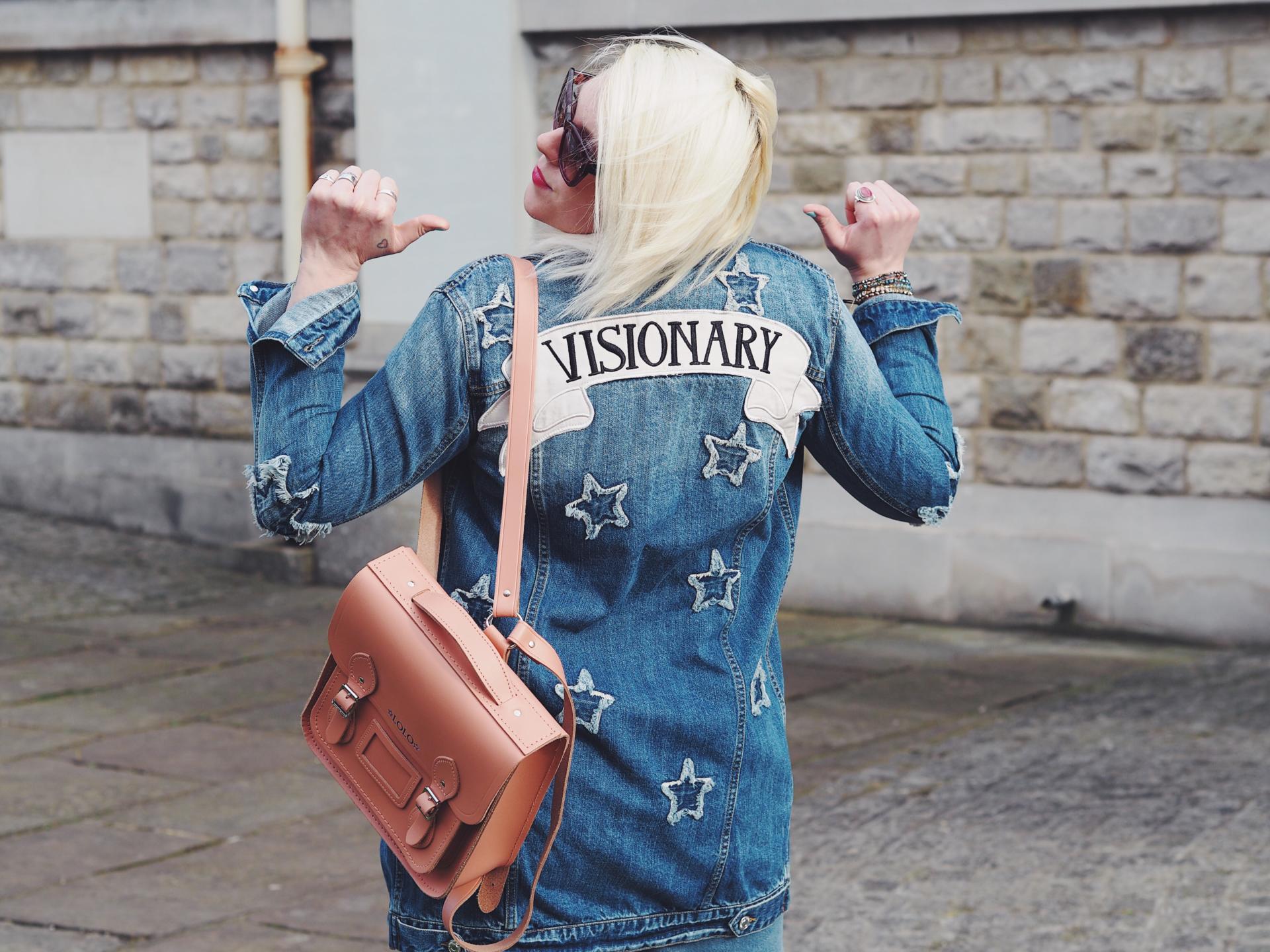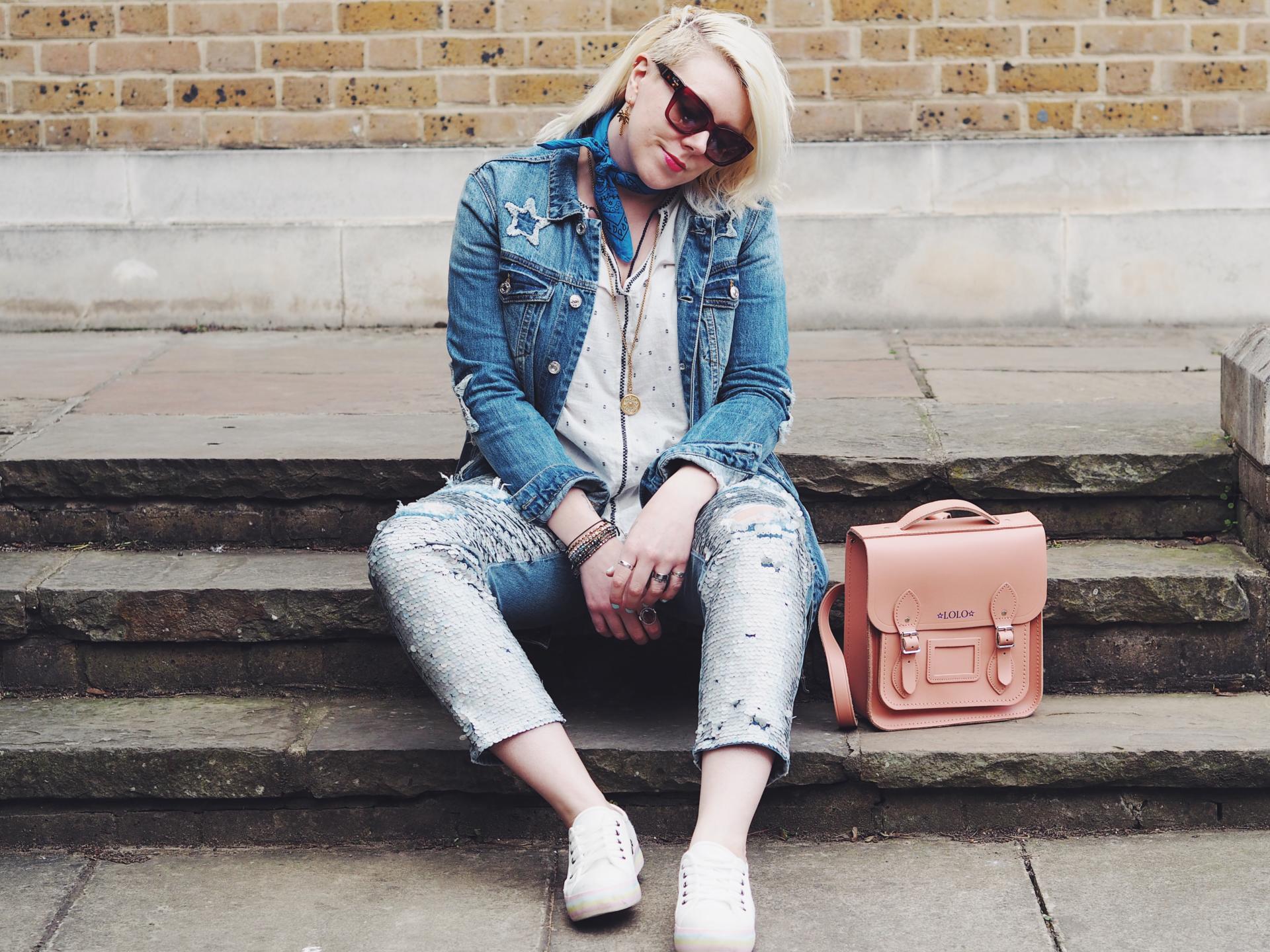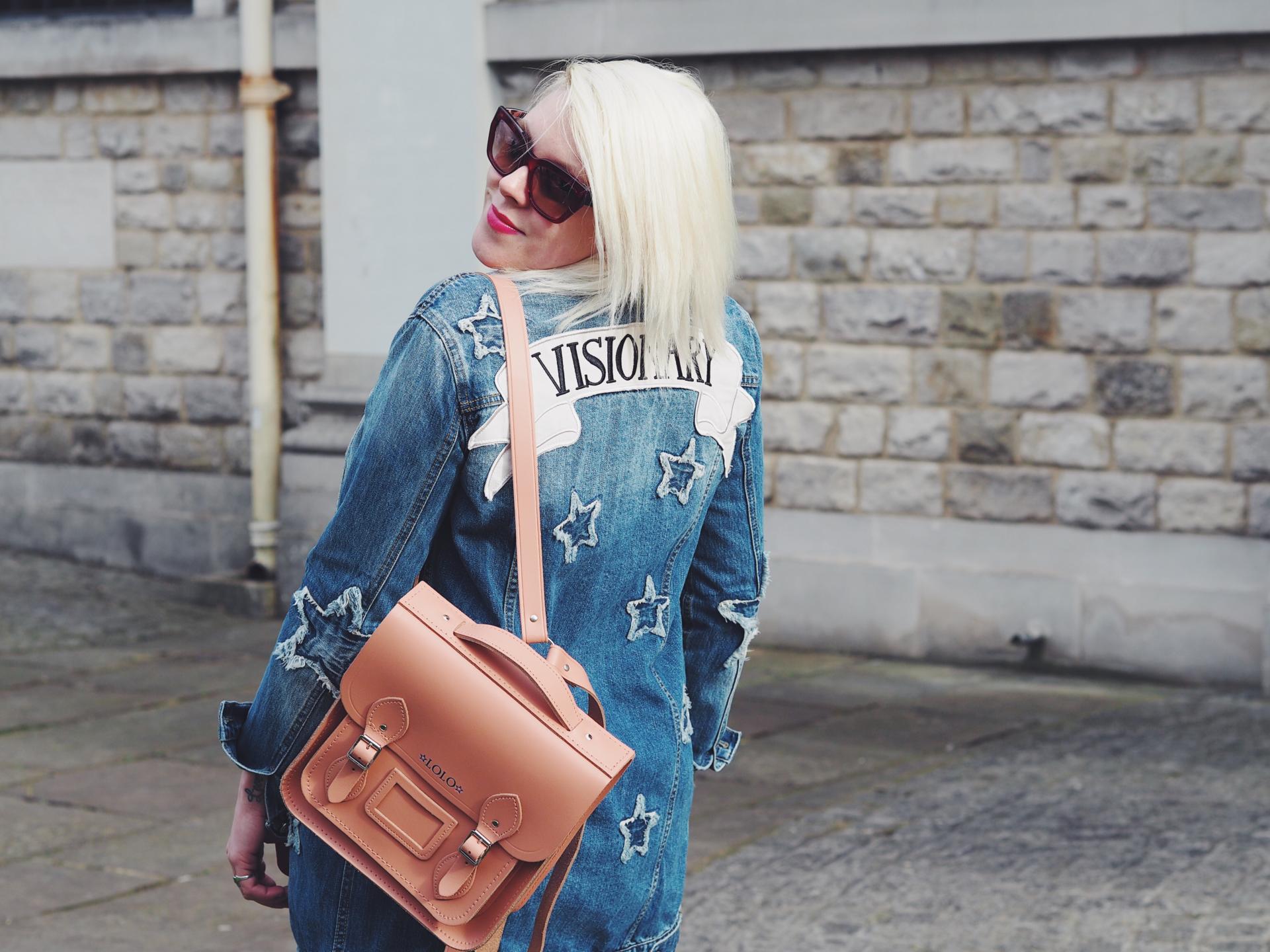 This #AMAZING jacket from Mango totally spoke to me when I fell upon it in their store and when clothing calls to you, you ANSWER! I utterly love the star patches, the back detailing and I think it looks so good with my outfit including these cute Rocket Dog platform trainers and my ever faithful Cambridge Satchel bag.