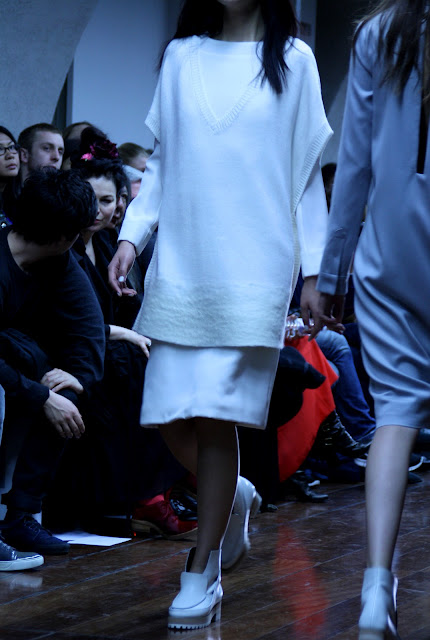 J JS.Lee was the perfect show to see some truly strong angler smart-wear and minimalism pieces. With a simple colour pallet of white, grey, navy, black & pale yellow, Jackie Lee is the ideal designer for those who want to have that perfect tailored item yet still wishes to wear it with designer and high street clothing.