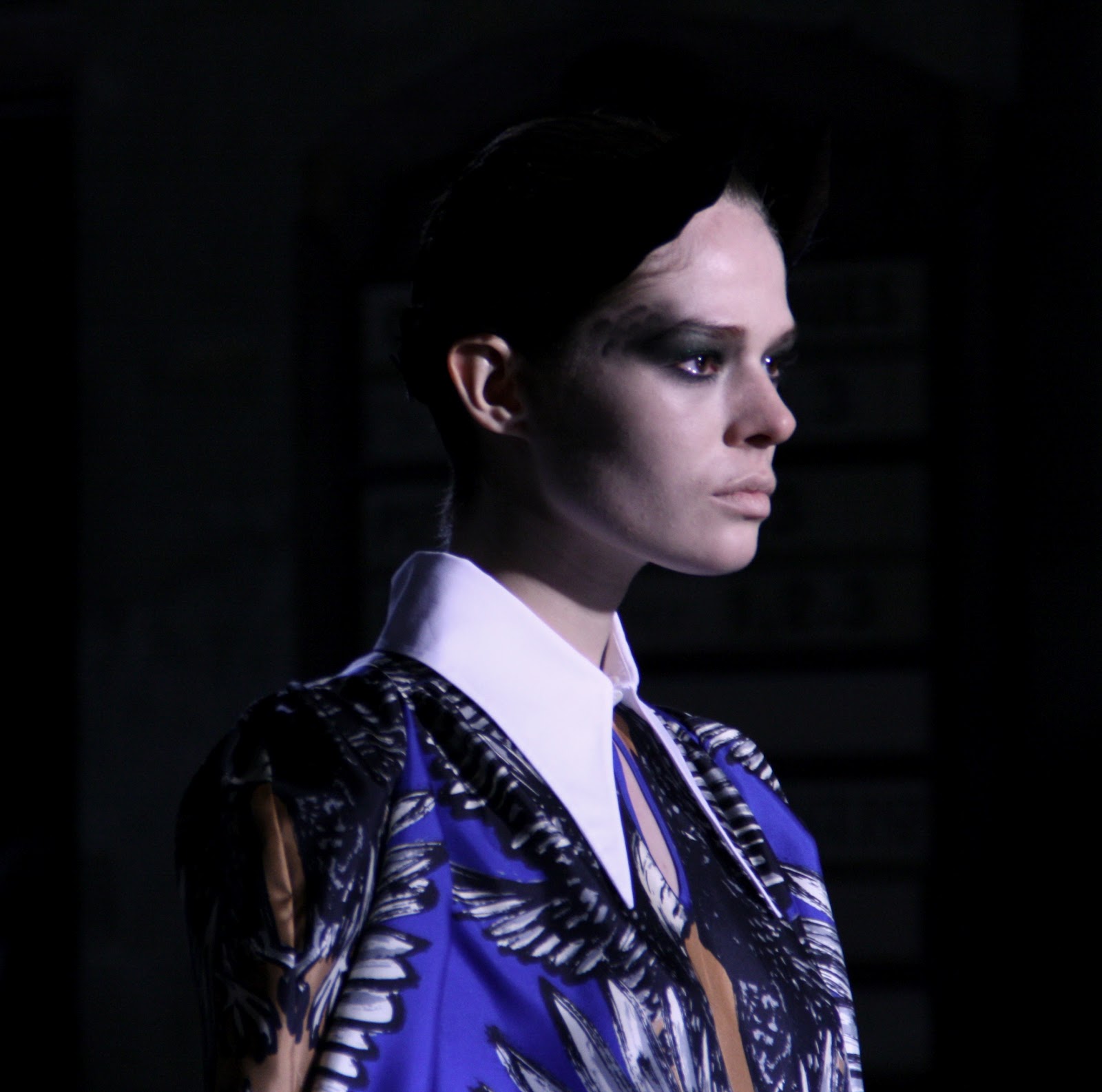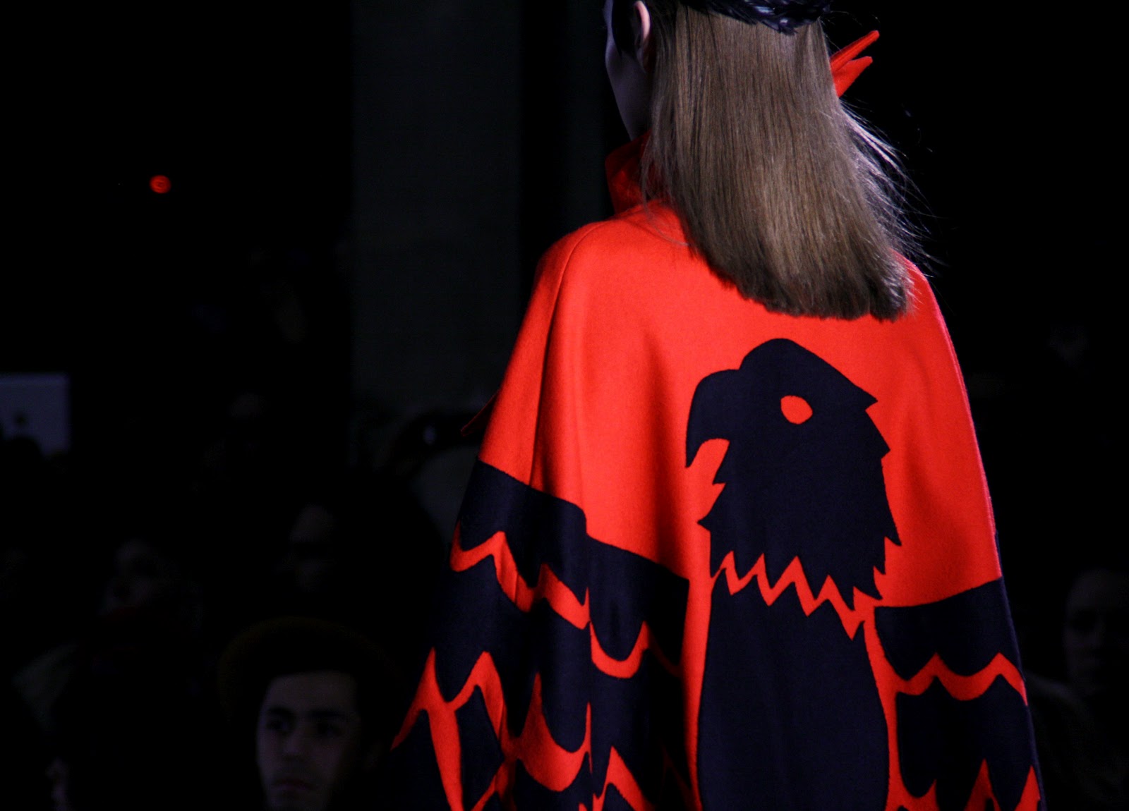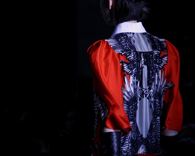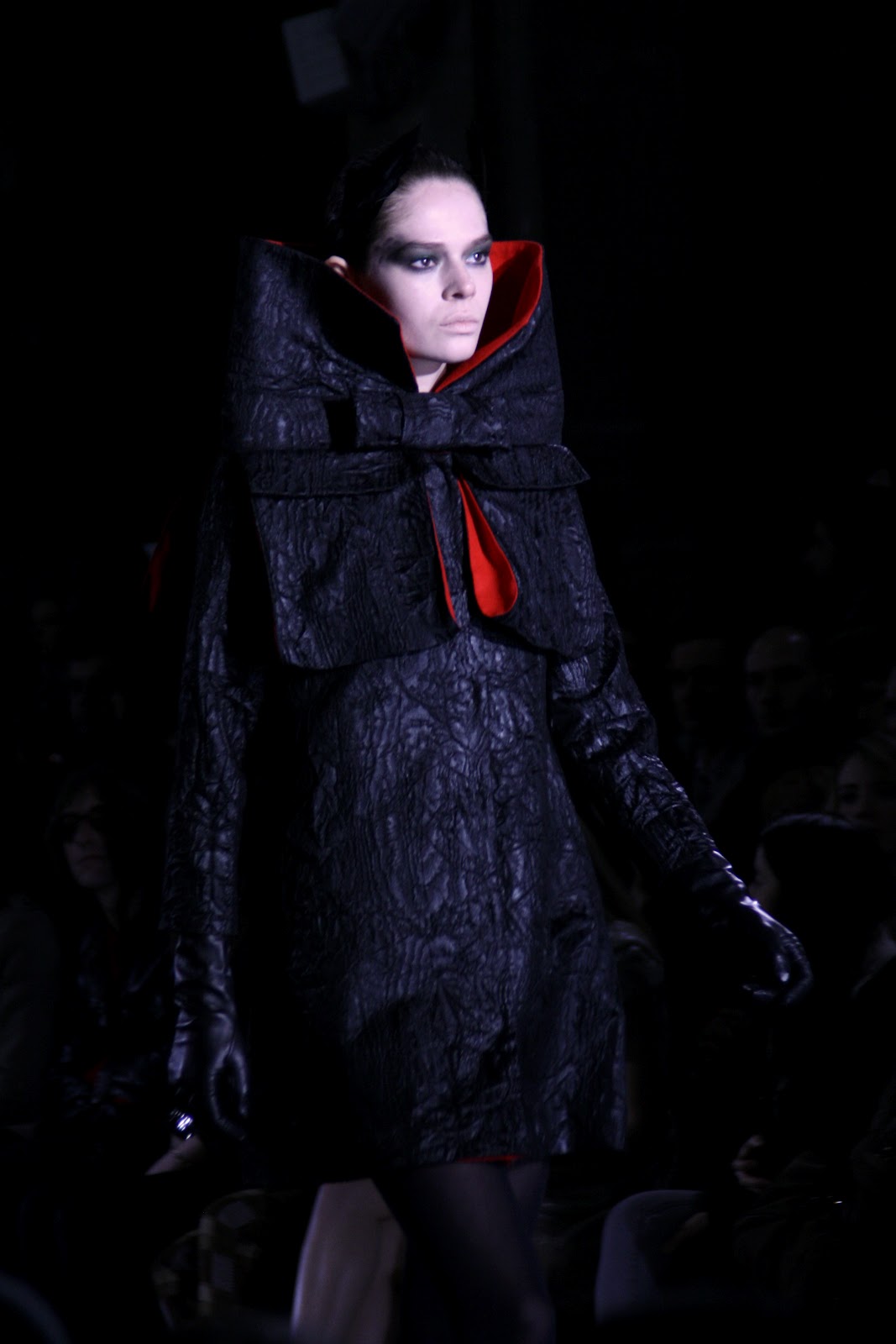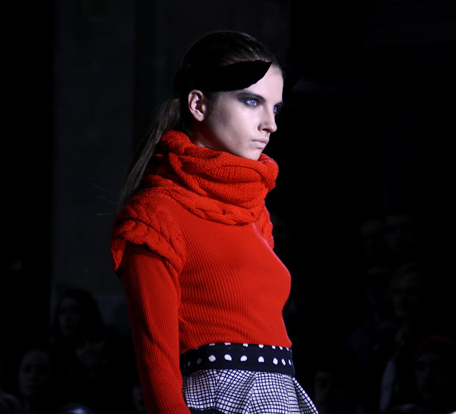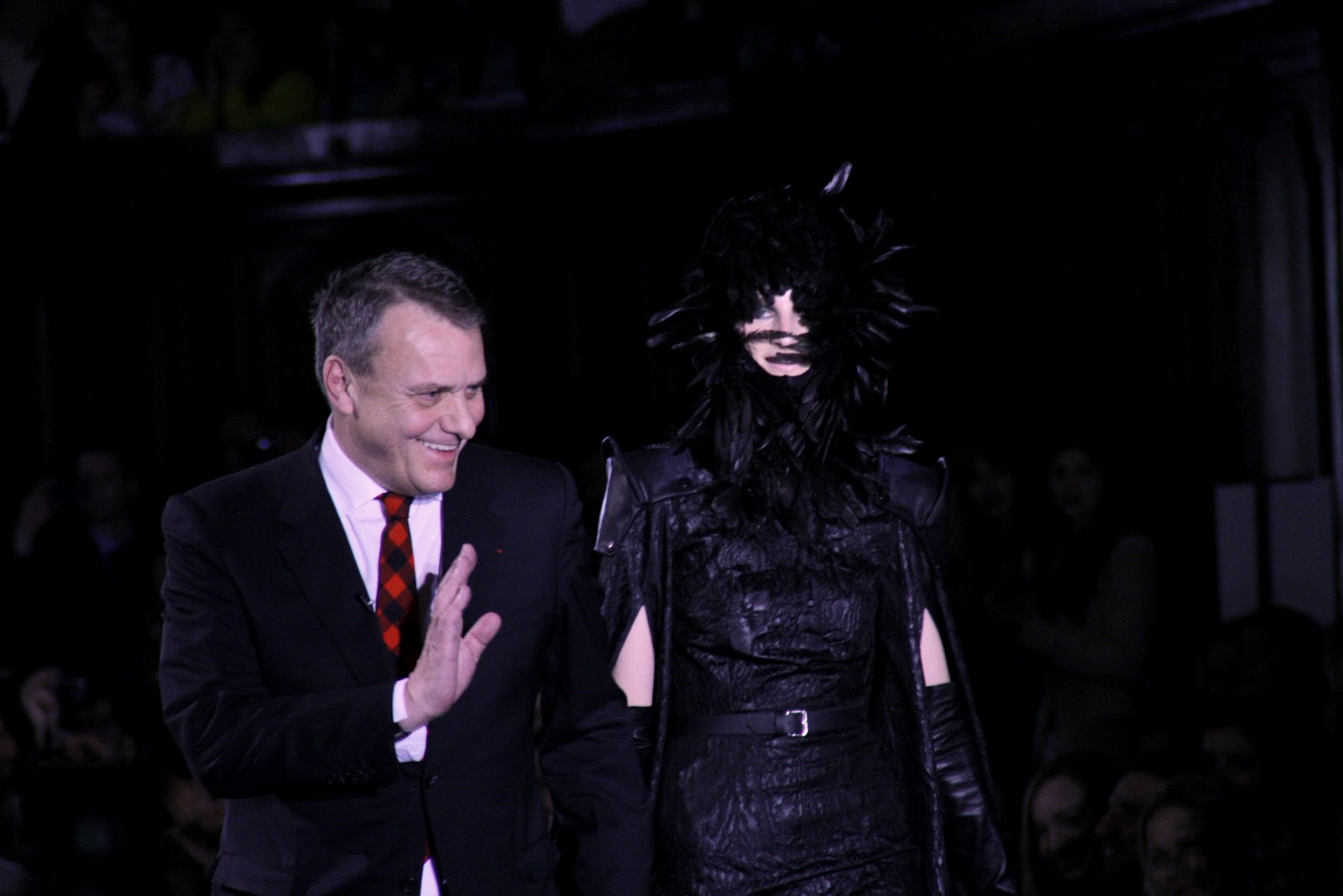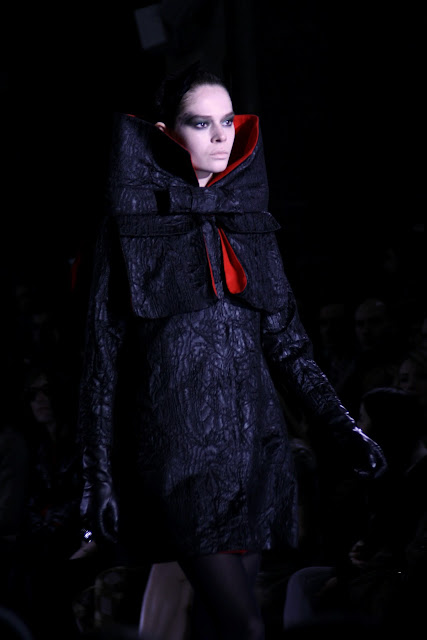 Dark and hellish demons must have raised their heads for the new Jean-Charles De Castelbajac show for A/W 2012. With exaggerated feathered headgear, Volcanic displays and flame patterned dresses, the audience must have been taken by surprise by Jean-Charles’ more serious and dark vision for a very cold and dark season. Among the collection, pieces that shone were the over-sized collar and belted coat, the multi-coloured wrap knit and the eagle print blouses and outerwear which really out flew the rest of the competition. As the designer has always had fun with his past collections, this new season seems to have taken a more serious and even message-baring route and given a new side to it’s creator and his new vision for us all.