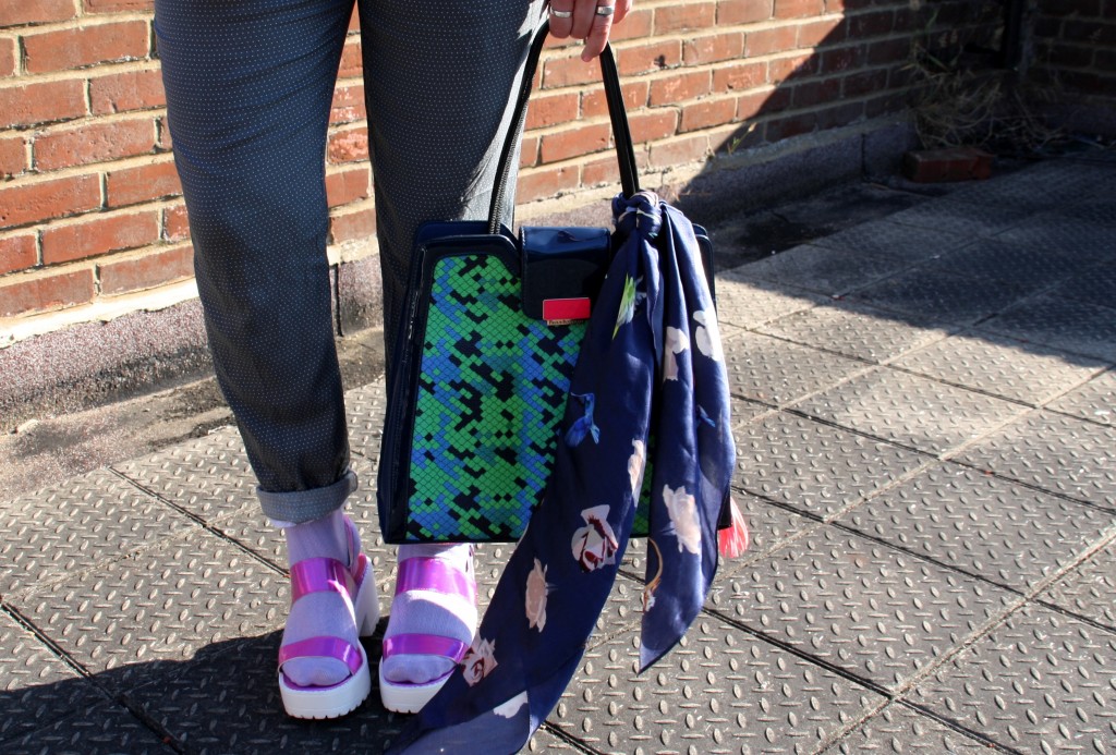 I have been waiting for the right outfit to wear to show you this scarf which I think matches perfectly with the colours and styles I am wearing here. Shinerock London has some beautiful silk print scarves including this bird and roses print one. It’s a really good item to accessorize with and I think it looks great tied to my bag for an easy and effortless style.