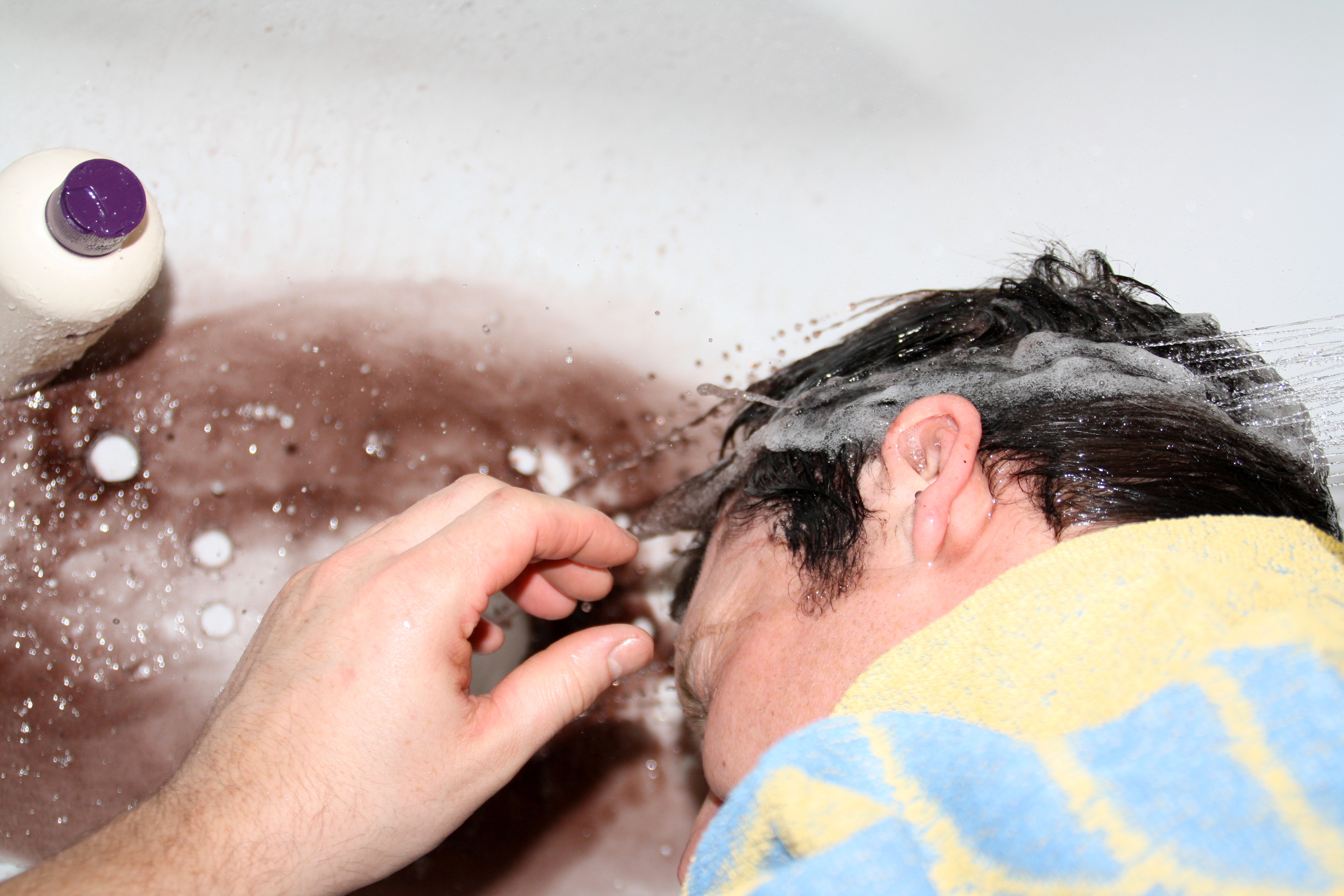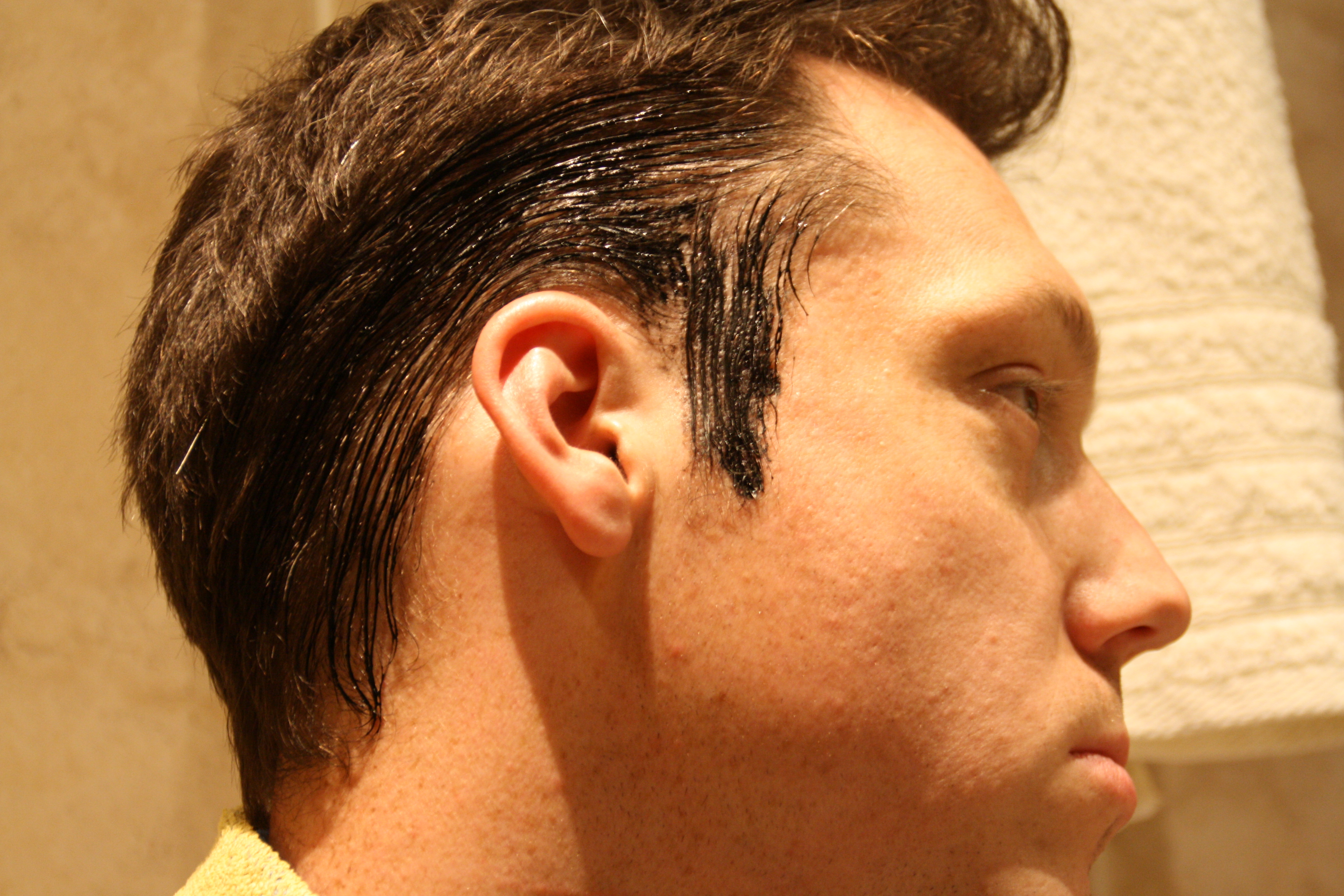 We decided to use the Dark Brown shade as Gary’s hair is pretty dark and this seemed to be a good match for him. After putting on the protective gloves and reading the instructions, I prepared the dye. Just for Men Autostop comes with a handy brush which makes applying the mixture so much easier than women’s dye. I brushed the mixture through Gary’s side burns and around his ears and this quick application made the process mess free.