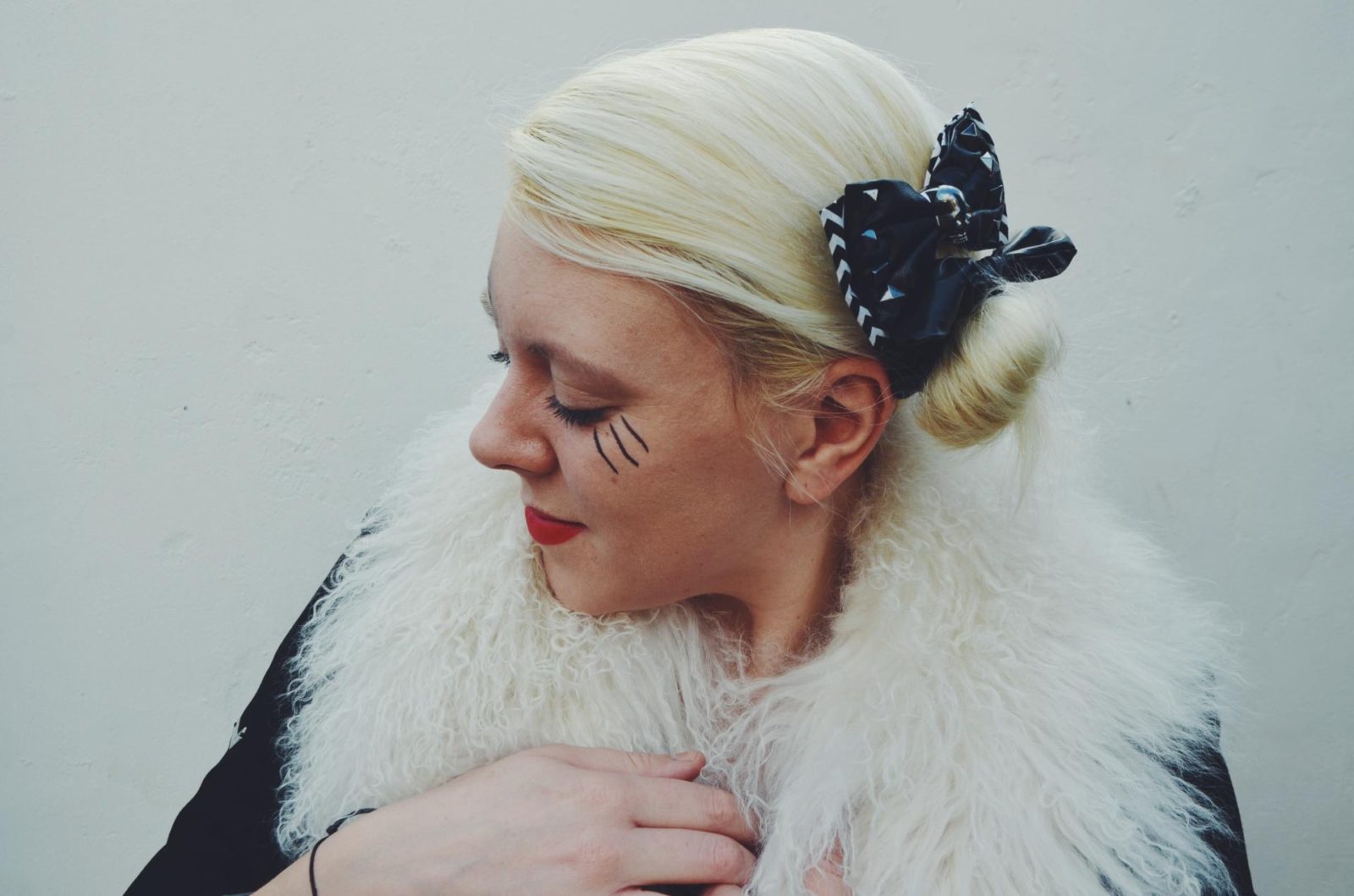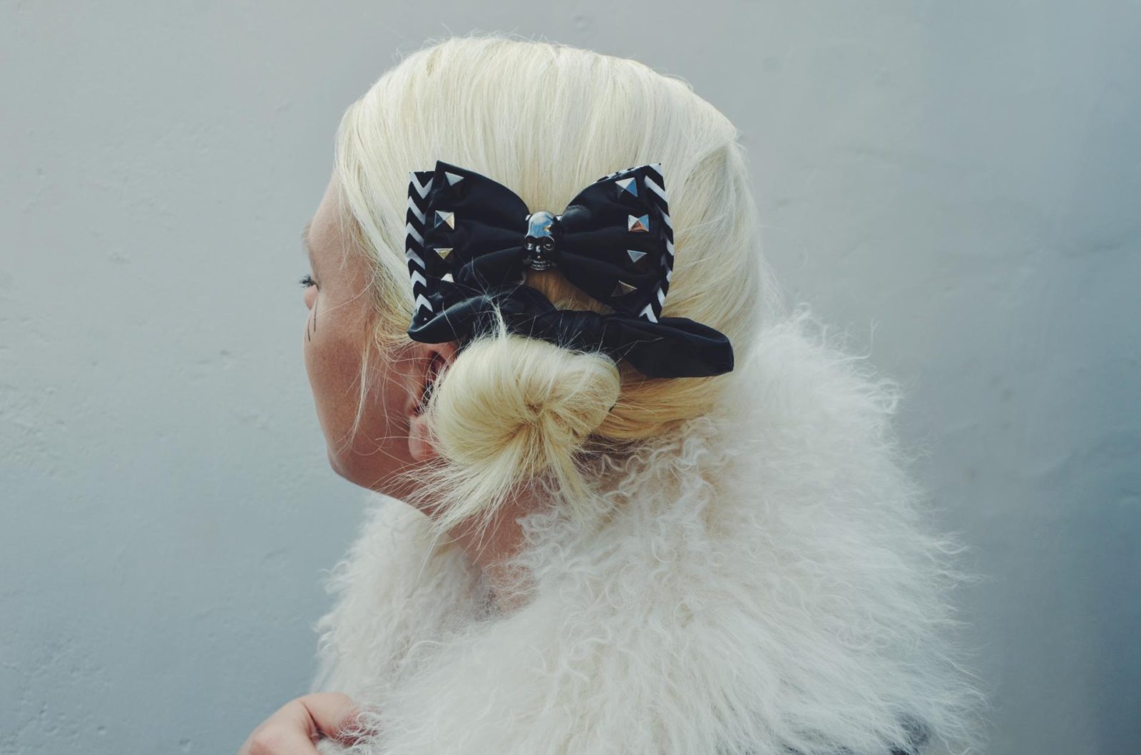 I wasn’t sure what to do with my hair at first but I thought a side bun was good contrast against my makeup style. The girls in the 60’s and 70’s used to wear oversized buns anyway so I thought it was a real nod to that generation. Toni and Guy have created some great hair accessories for Halloween so I thought I would try this cute 🐰 ear hairband and rocky chic 💀 bow. Using your brush, direct the hair to the side you want your bun to be. As my head is half shaven, the decision was pretty easy for me to make.
