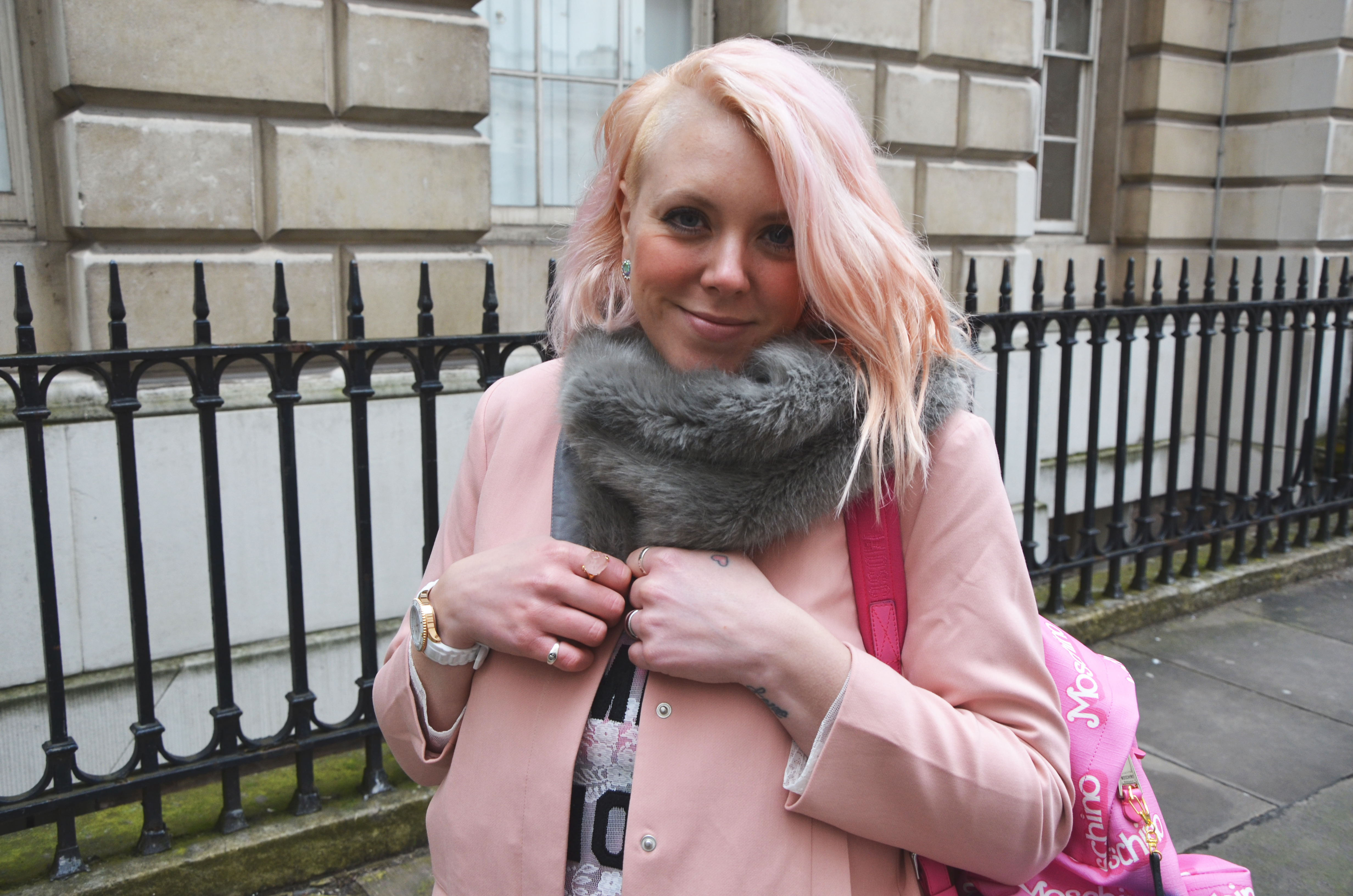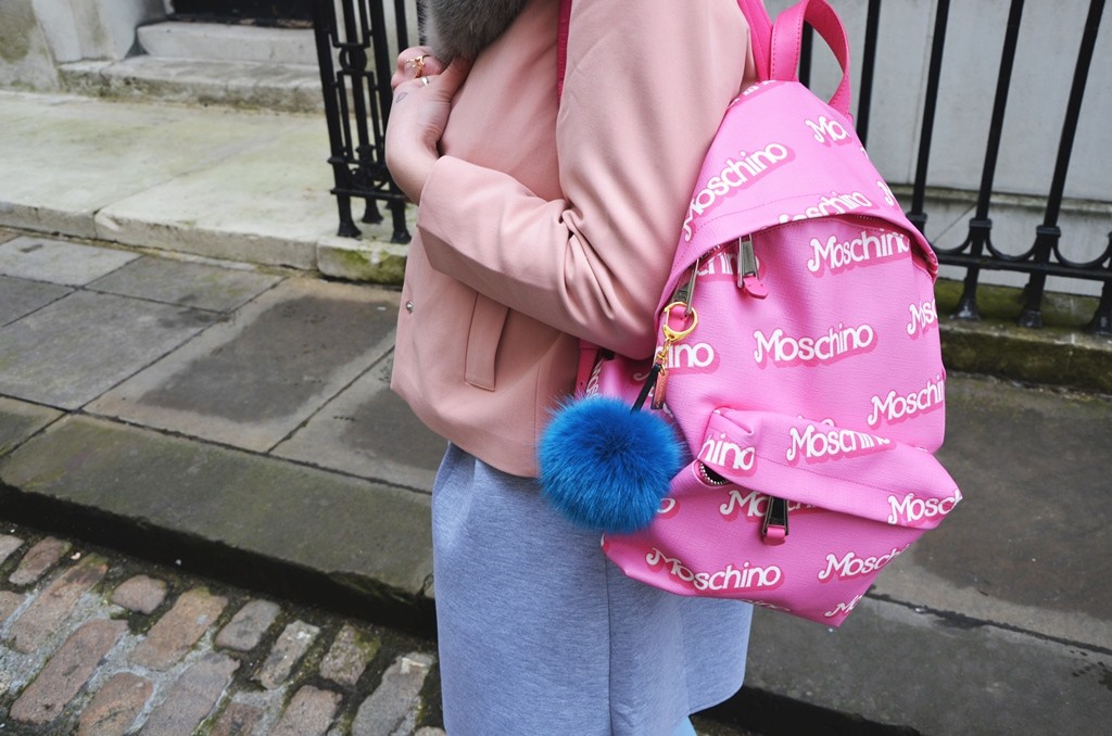 My Moschino bag has attracted a lot of attention at LFW and as I needed something big for all my tickets, schedule, makeup and camera, I thought this Barbie rucksack was perfect as a statement piece and to also carry all my crap around too. With a large compartment and some smaller ones inside, this bag is an icon item in it’s own right and I just love the look, colour and style of this fabulous Barbie piece!