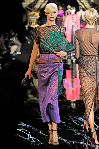 Lace, sheer and fringing created the sexy siren look straight from a iconic movie set while the orient inspired shapes like the wrap around dresses, two piece sets and large sleeve detail set the mood of the Eastern land. The models carried fans in array of designs adding to the finishing touched of the wonderful show. The whole atmosphere took the audience back to a more glamours time when movie stars would walk the red carpet and drape themselves over a red plush Chaise Longues just to talk to their audience.
