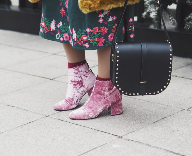 I also thought I would wear this cute embroidered skirt I bought from Zara. The length is just perfect for winter and I thought the floral design was just adorable and the green totally works too.