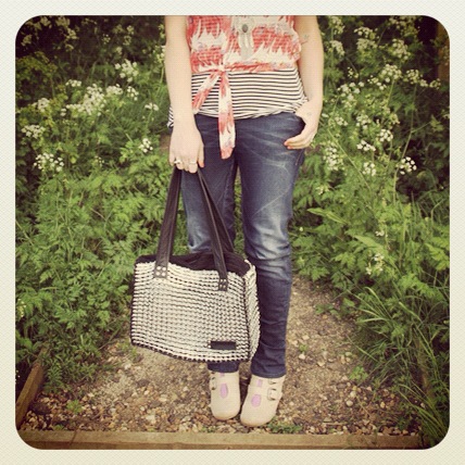 Bottle top are the unique bag brand that work with undeveloped countries to create beautiful bags with the help of bottle tops! The bag I am modelling here is the Samba which comes in Brown or Black leather and is very well made.Top – Pop CoutureStripe top(underneath) – HM