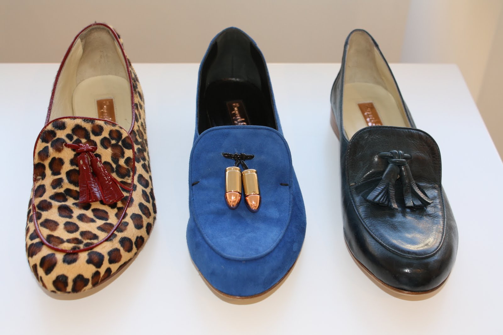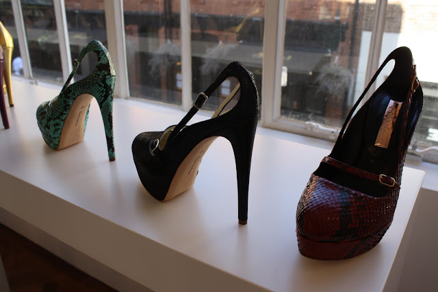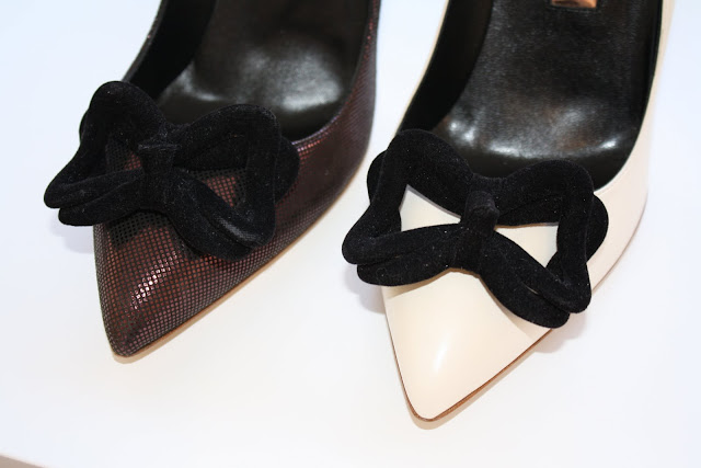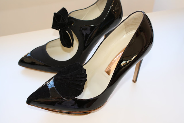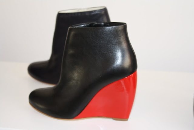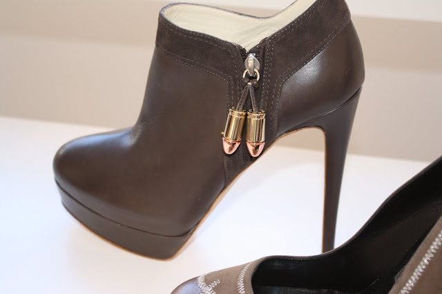 Shoes and more shoes, decorated the Rupert Sanderson show room and with key details and extras, the new A/W 2011 season looks to be a very strong one indeed. with Bullet charms hanging from boots and loafers, velvet bows on courts and mesh inserts, there was plenty to admire for the new season. Among my favorites were the wedge boots with the colour blocked heel, perfect for the colour blocking trend and for a statement shoe to brighten up a rather toned down outfit.