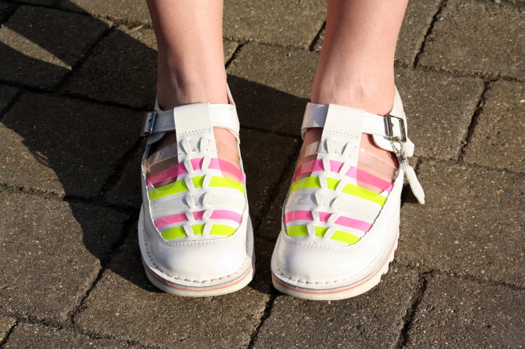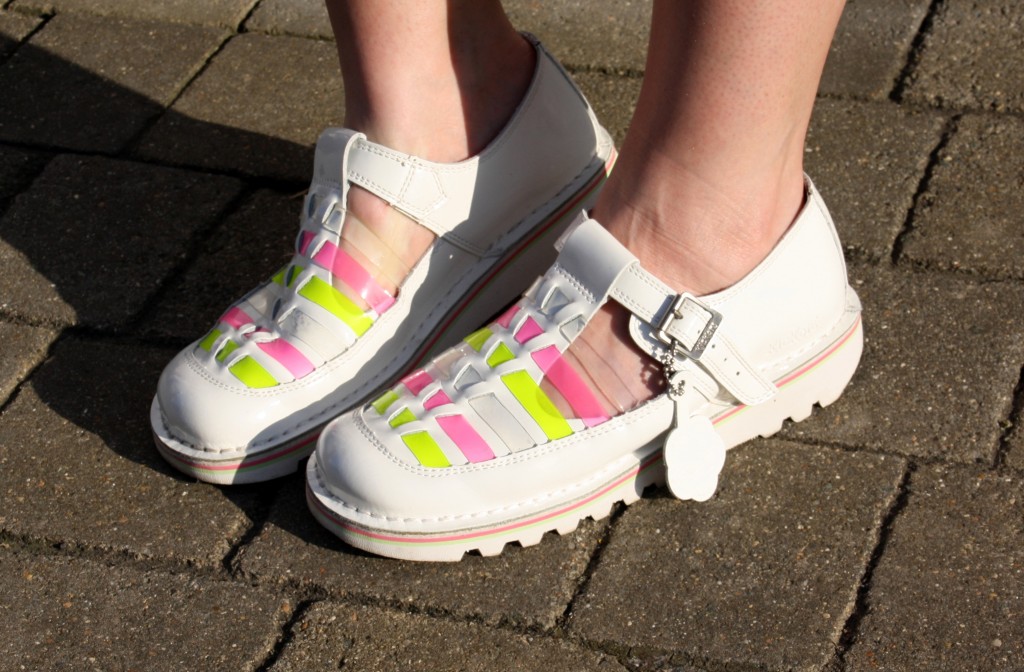 I nearly fainted when I saw these Hurache Kickers in the white with Neon straps so I knew I had to do a post with them! I have been wearing Kickers for large chunks of my life so it was time that I revisited the brand that I wore lots through my younger years. The Hurache shoes are so comfortable and I love that Mary Jane T-bar shape has been injected into this style. The shoes have a bouncy sole making them really comfortable and these shoes will look great with shorts, skirts and skinny jeans rolled up!