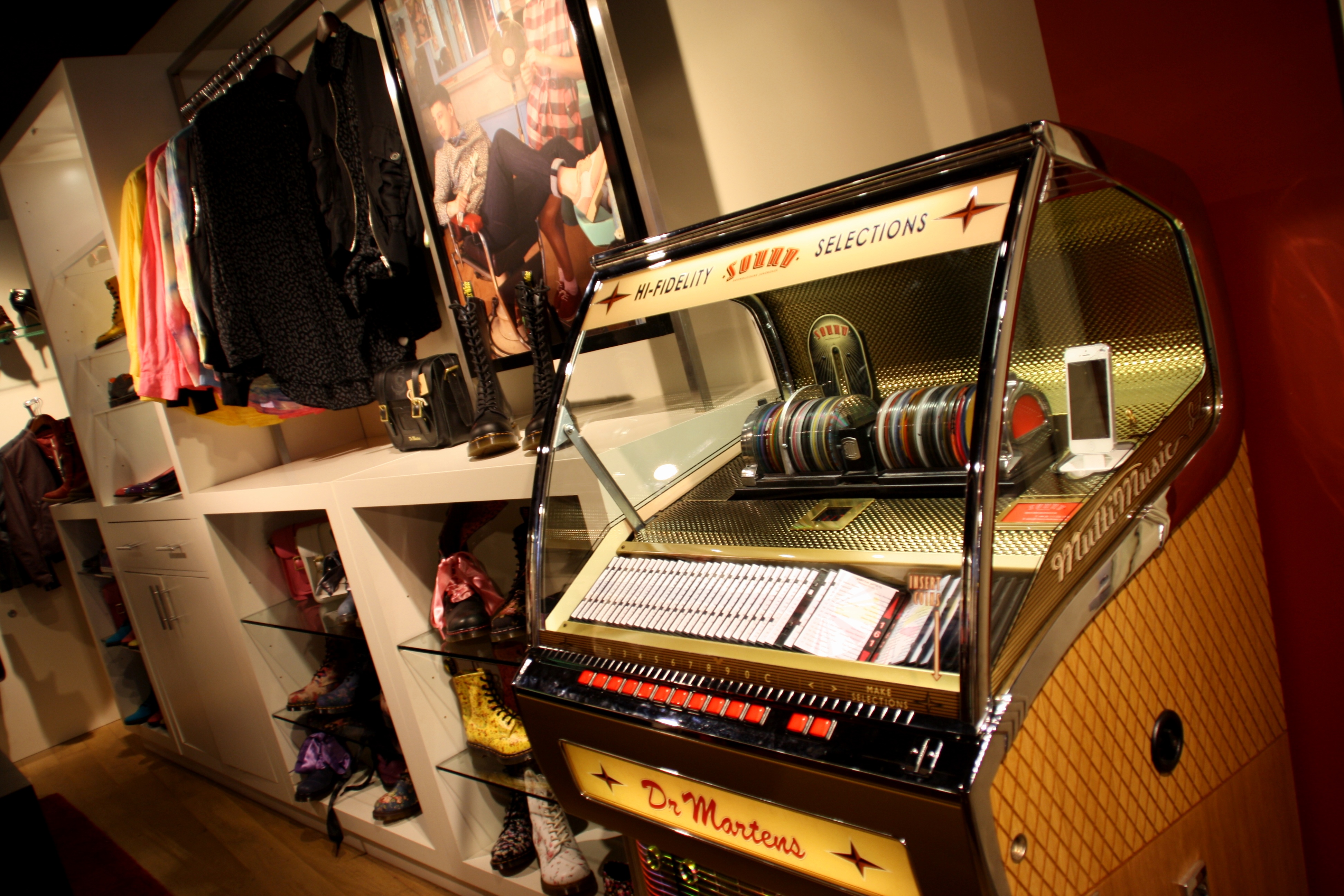 As I am always used to the old school layout of the Covent Garden store, it was nice to see the desired style that Dr Martens are putting out there for their customers. The store itself has a more cleaner cut look then their Covent Garden store and a strong heritage inspiration that is everywhere from the wooden fixtures to the vintage leather sofa’s. There is also a classic looking jukebox that has some ‘London’ inspired music and customers can play whatever they like for free.
