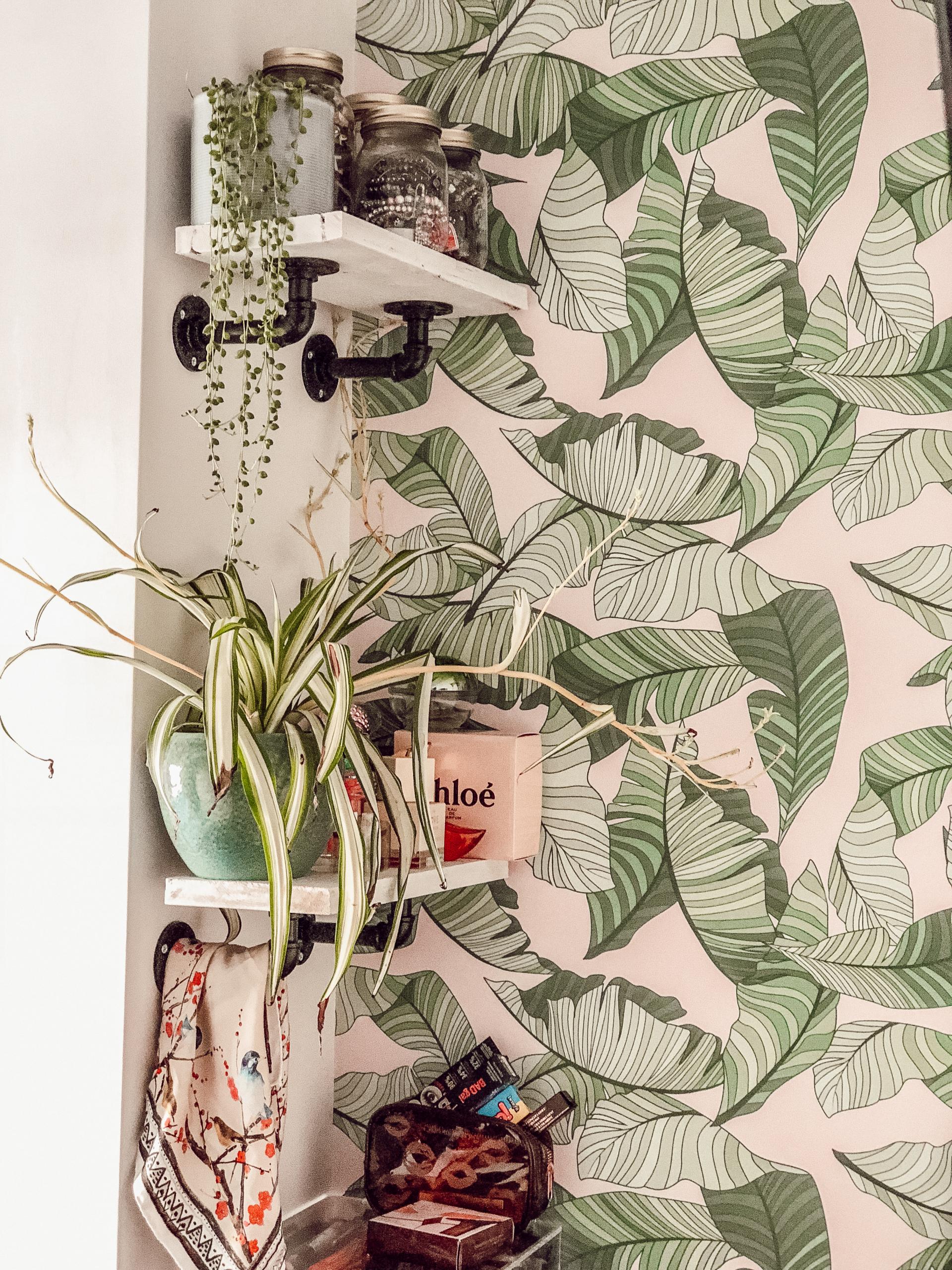 I really wanted some plants in our room so I bought some from Waitrose and had them delivered. I think they really finish off our room and we recycled some of the old floorboards from our house and painted them white to create these shelves for my new plants and perfume too.